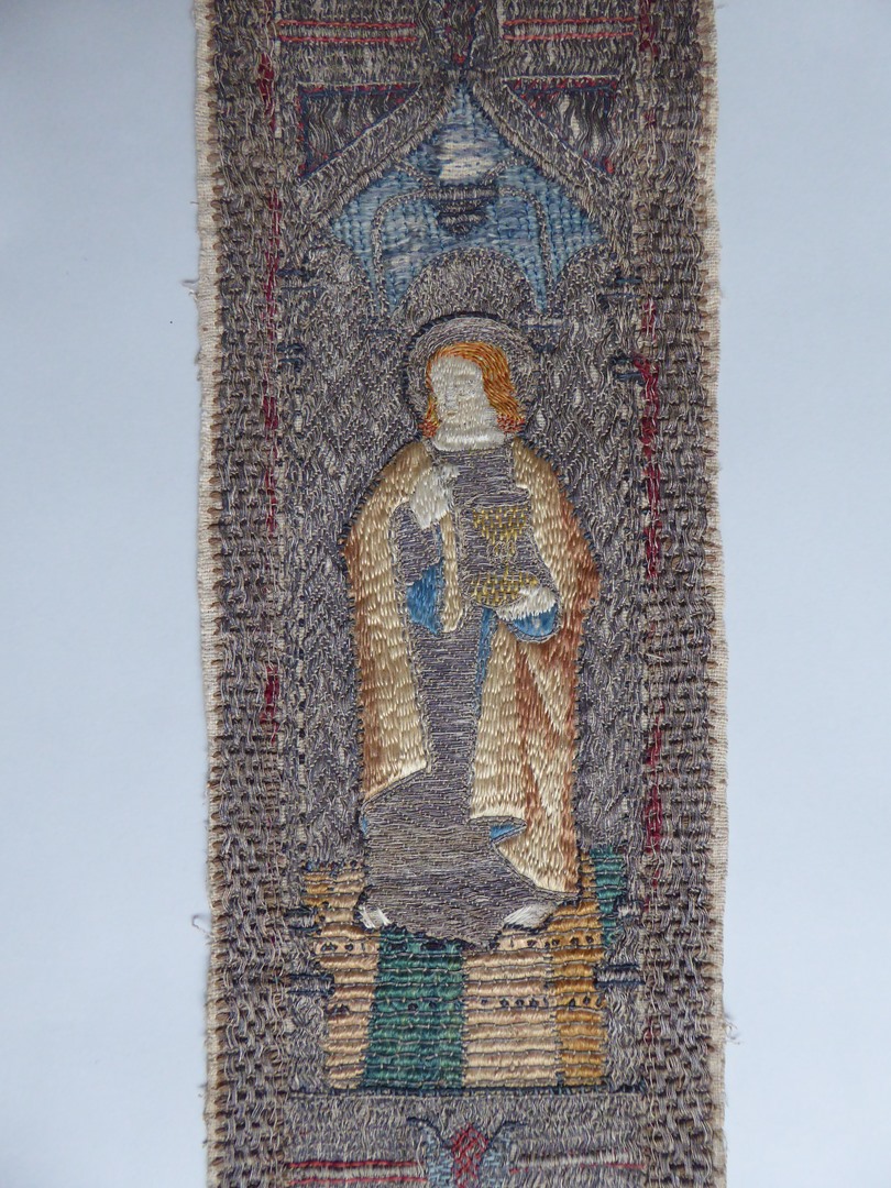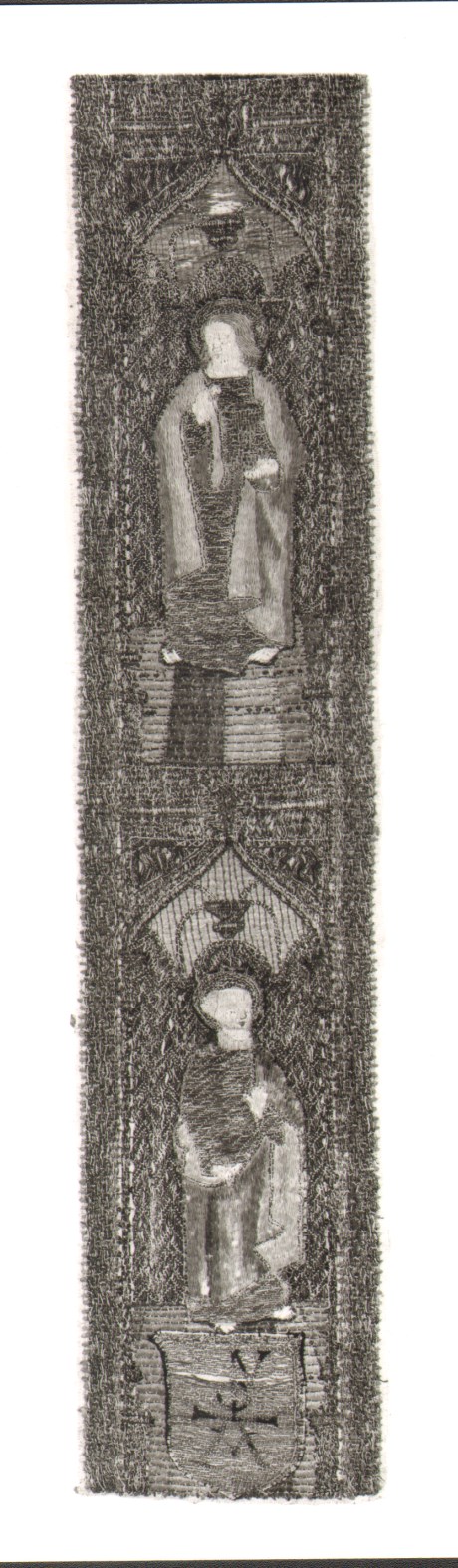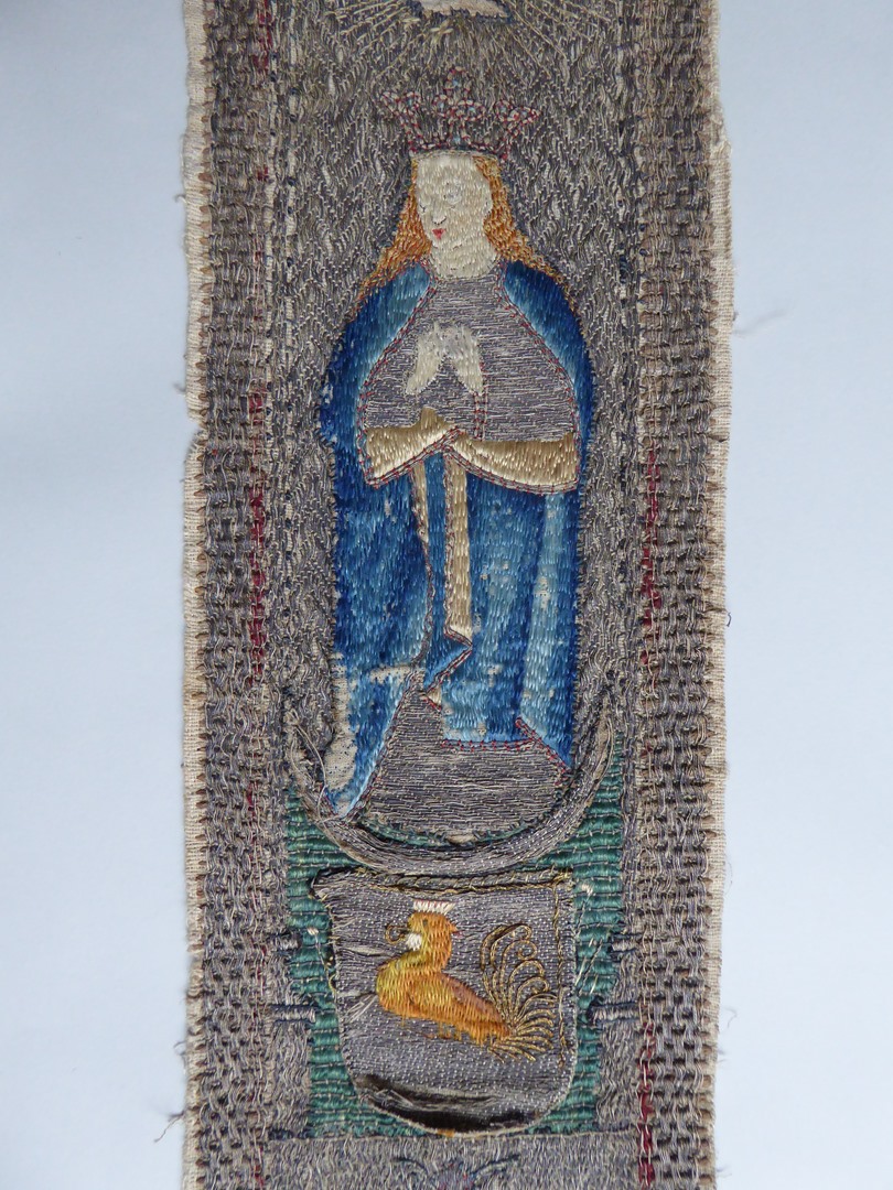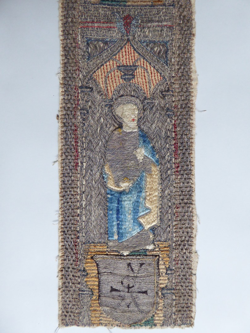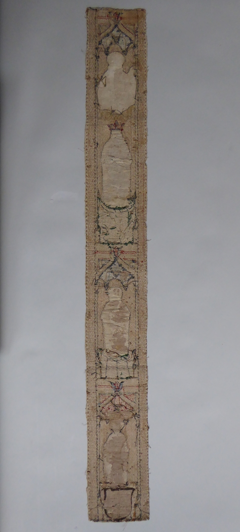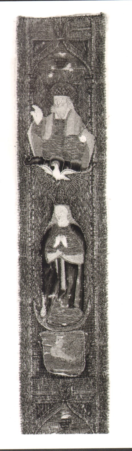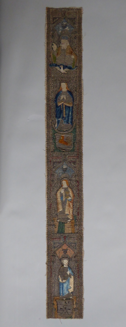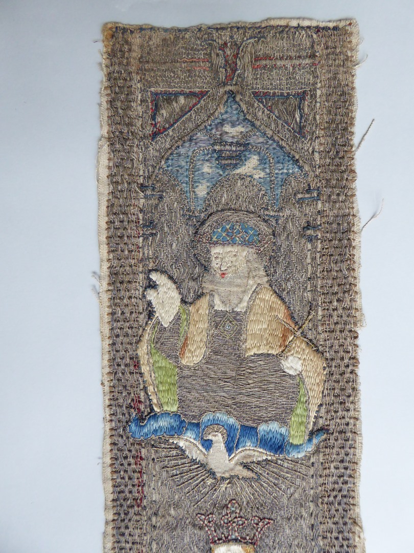 In een drietal velden zijn onder baldakijnen met een eenvoudig kruisgewelf en nodus tegen een gedamasceerde achtergrond v.b.n.b. de volgende figuren weergegeven: ten halve lijve God de Vader, gekroond en gehuld in een koormantel. Hij maakt met de rechterhand een zegenend gebaar, in de linker de wereldbol met het kruis. Hij steunt als het ware ...