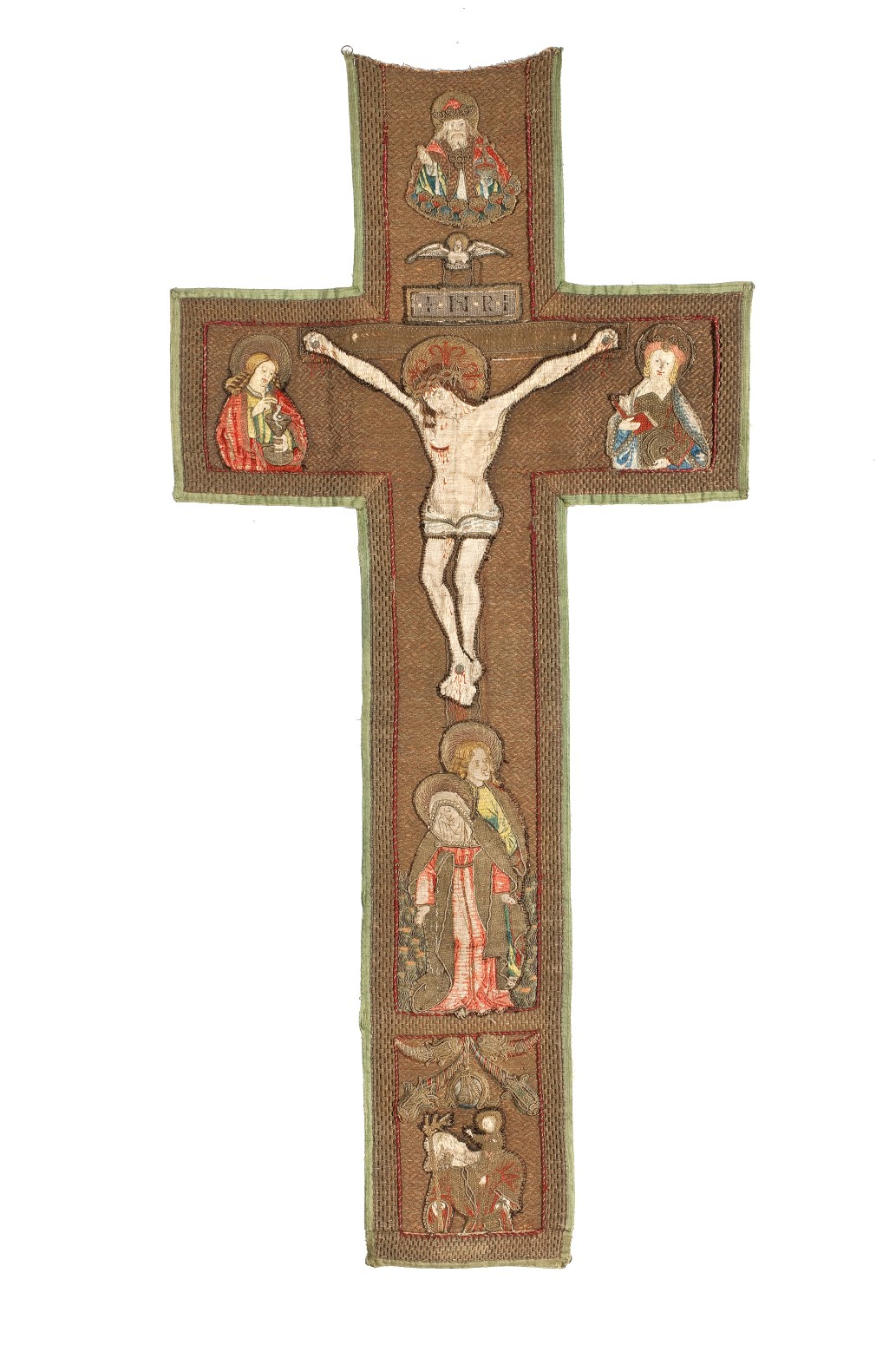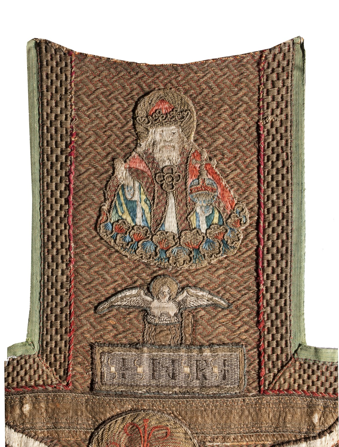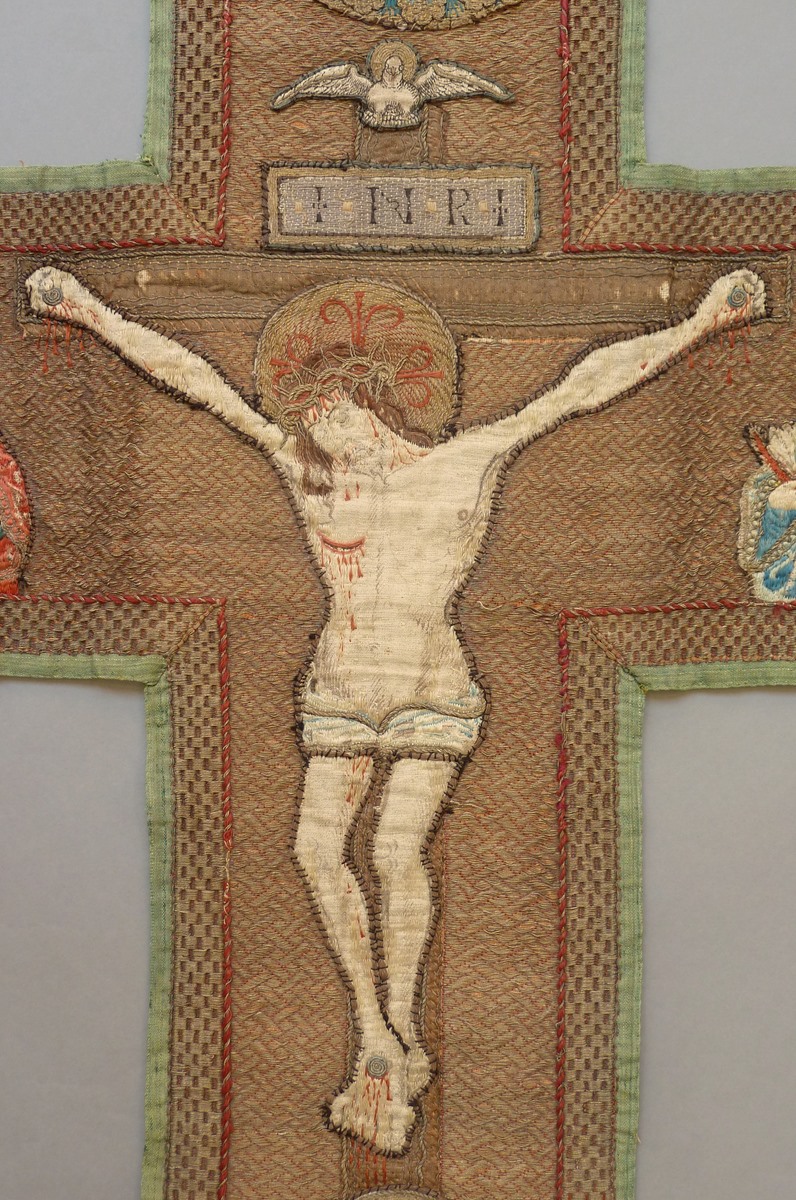 Het borduurwerk in kazuifelkruisvorm heeft een achtergrond van gelegd gouddraad gehecht in een wafeltjespatroon. Centraal staat een Calvariescene. Christus hangt aan het kruis, gekleed in een lendedoek. Boven hem het op het kruis aangebrachte tekstbord met I.N.R.I., de H.Geest in de gedaante van een duif en ten halve lijve God de Vader, gezeten op een ...