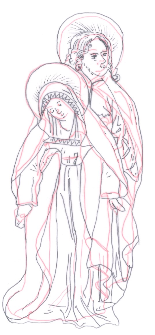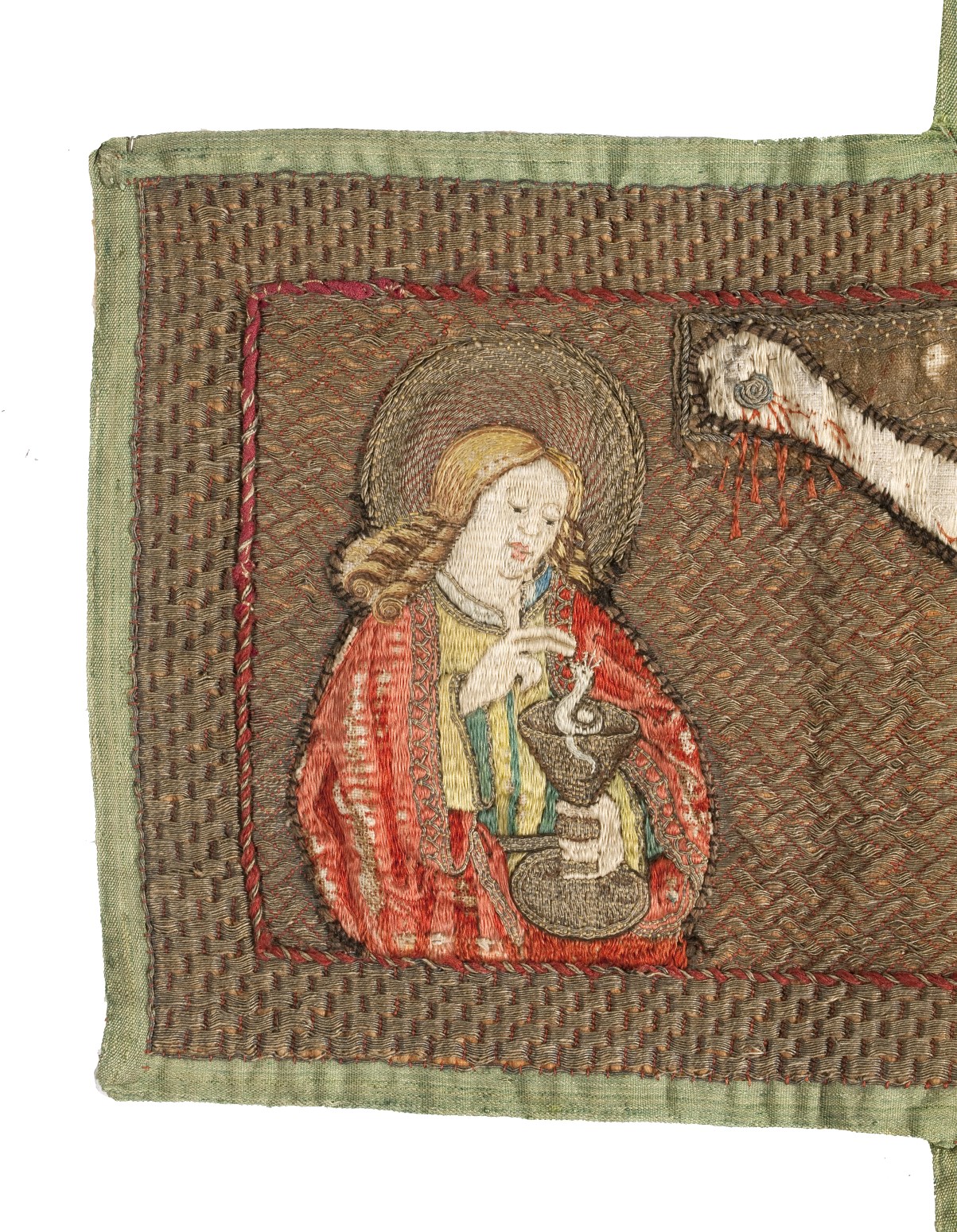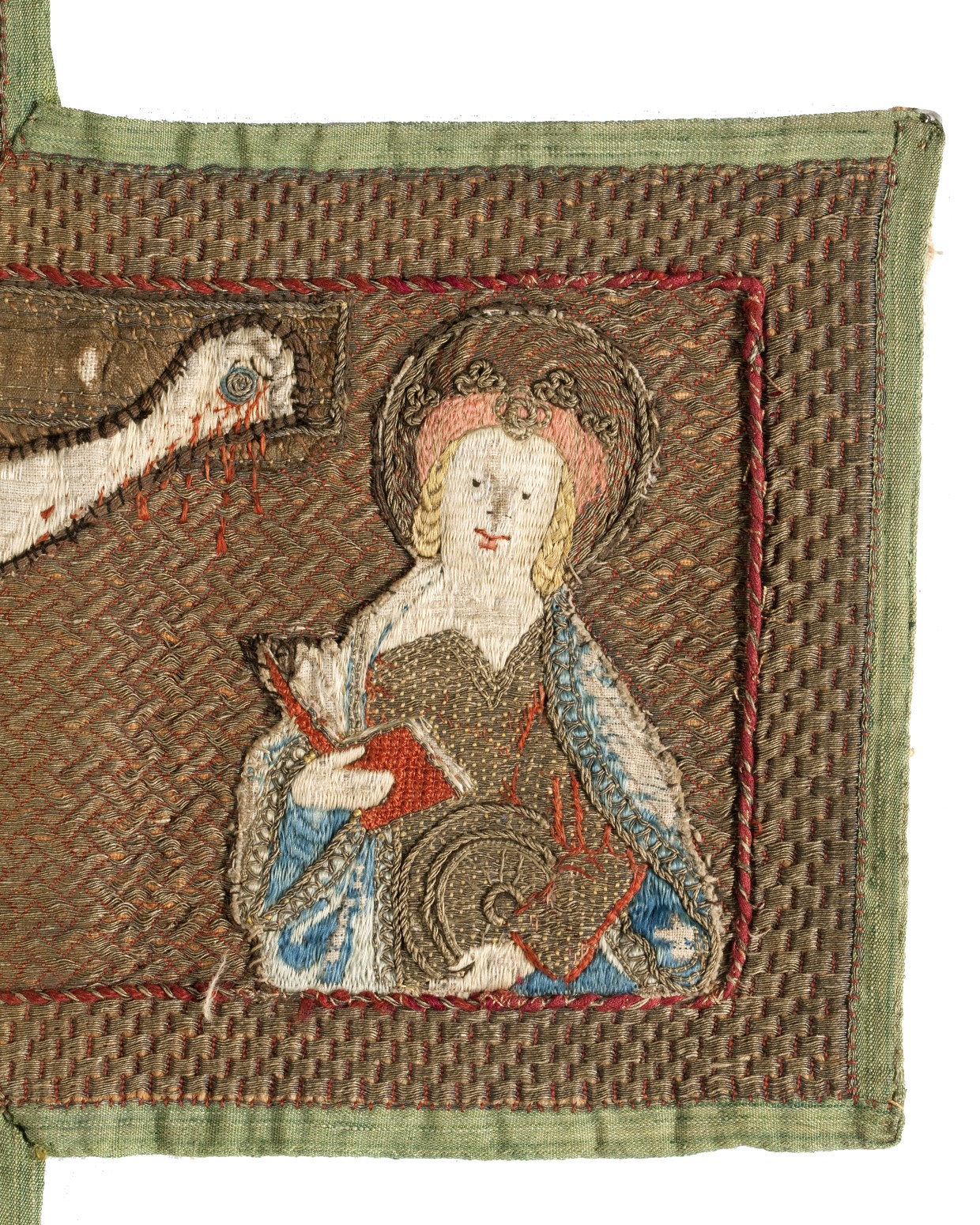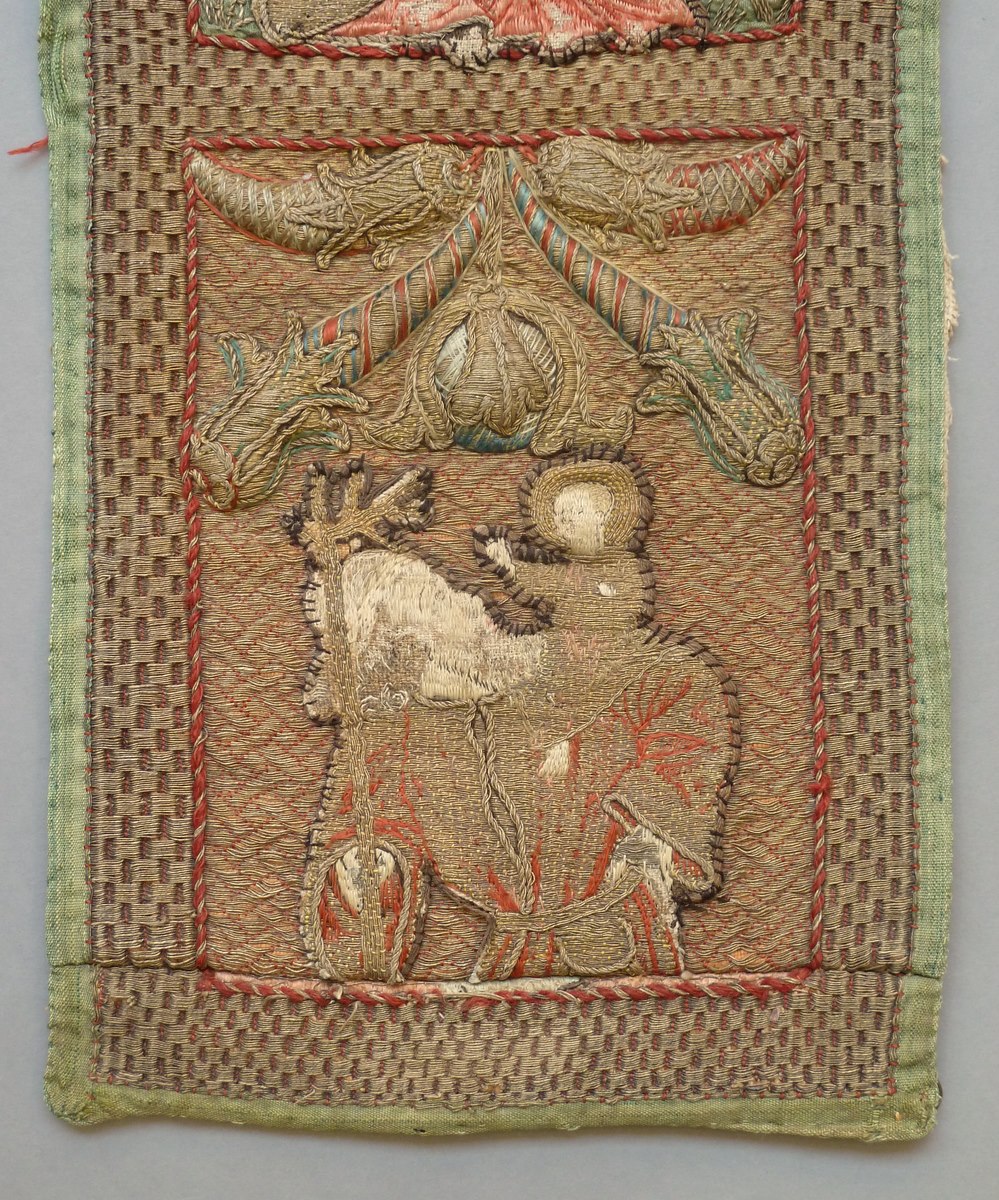 Het borduurwerk in kazuifelkruisvorm heeft een achtergrond van gelegd gouddraad gehecht in een wafeltjespatroon. Centraal staat een Calvariescene. Christus hangt aan het kruis, gekleed in een lendedoek. Boven hem het op het kruis aangebrachte tekstbord met I.N.R.I., de H.Geest in de gedaante van een duif en ten halve lijve God de Vader, gezeten op een ...