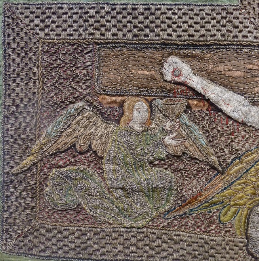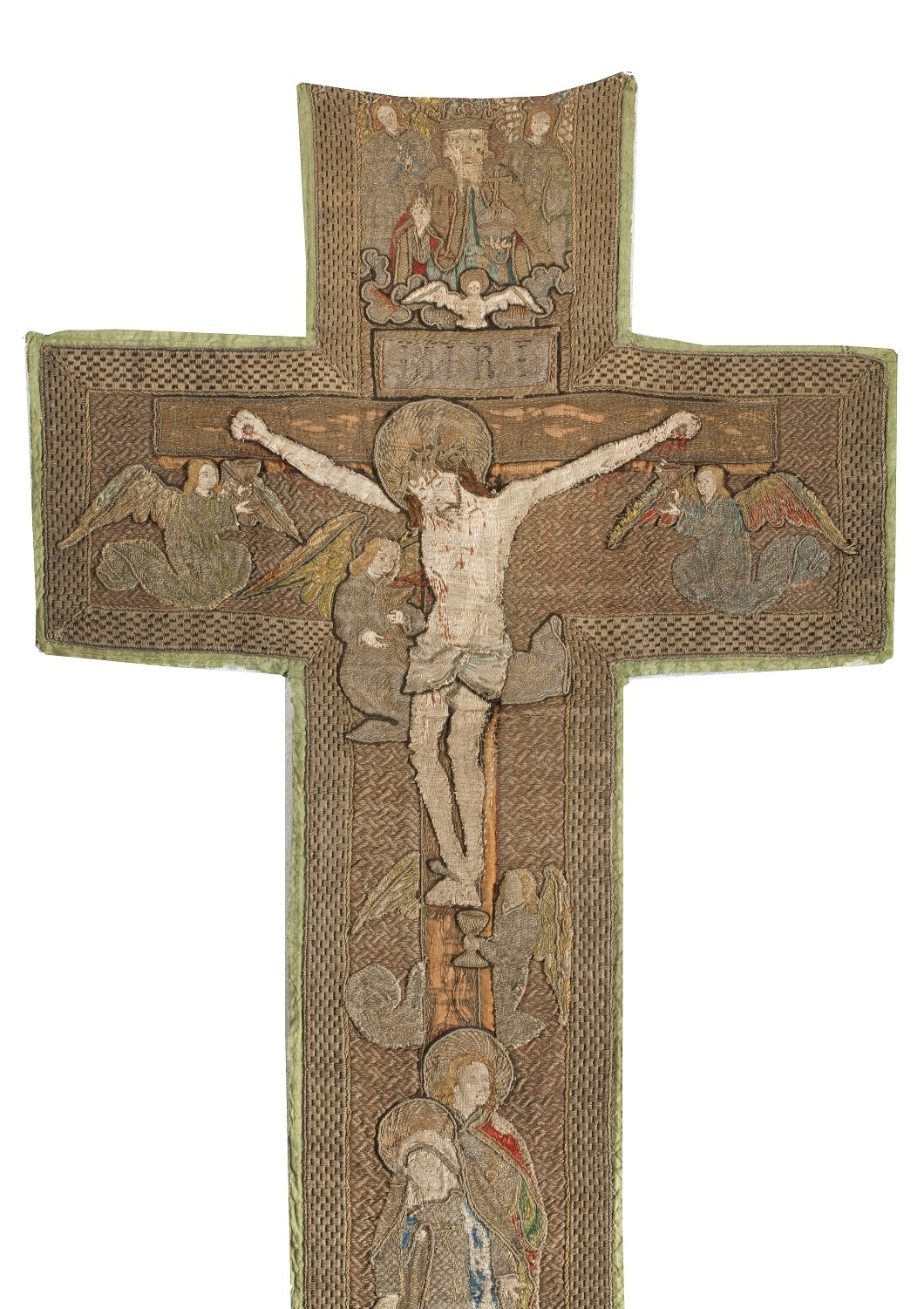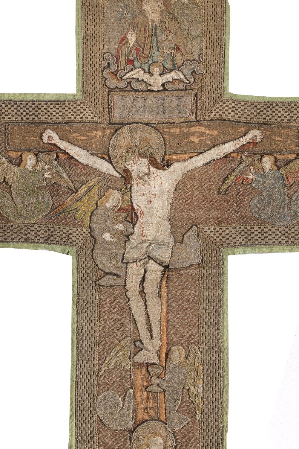 Op het kazuifelkruis wordt een Calvariescene afgebeeld. Centraal op een begroeide heuvel de gekruisigde Christus gekleed in een lendedoek. Vier engelen met uitwaaierende gewaden zweven om het kruis en vangen in kelken het heilig bloed uit de kruiswonden op. Boven Christus de tekst I.N.R.I., de H. Geest in de gedaante van een duif en God ...