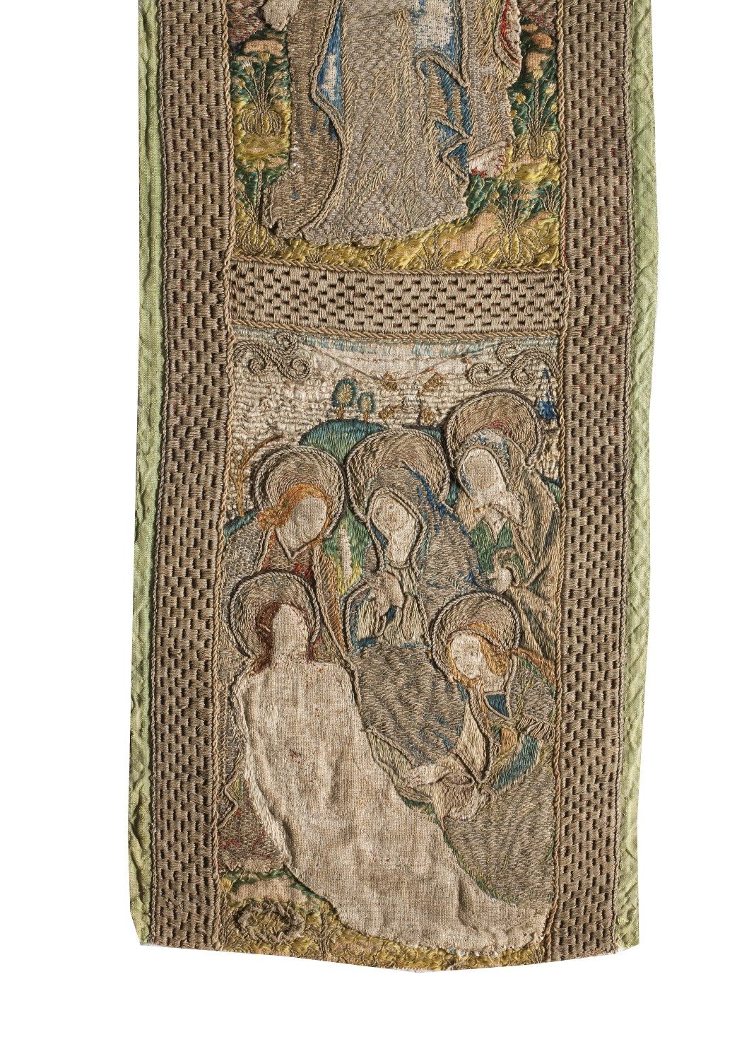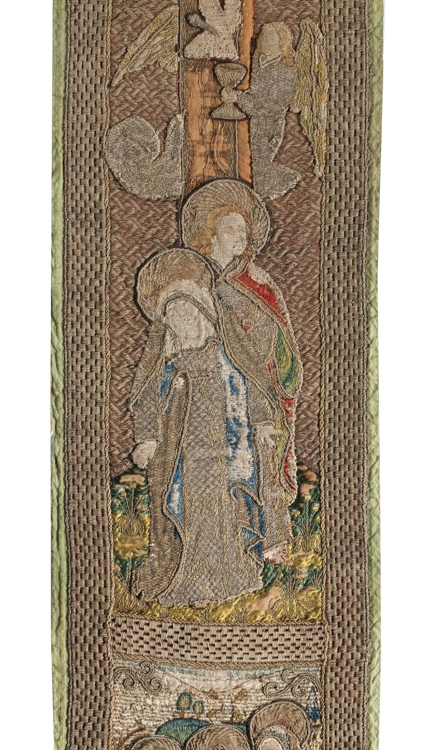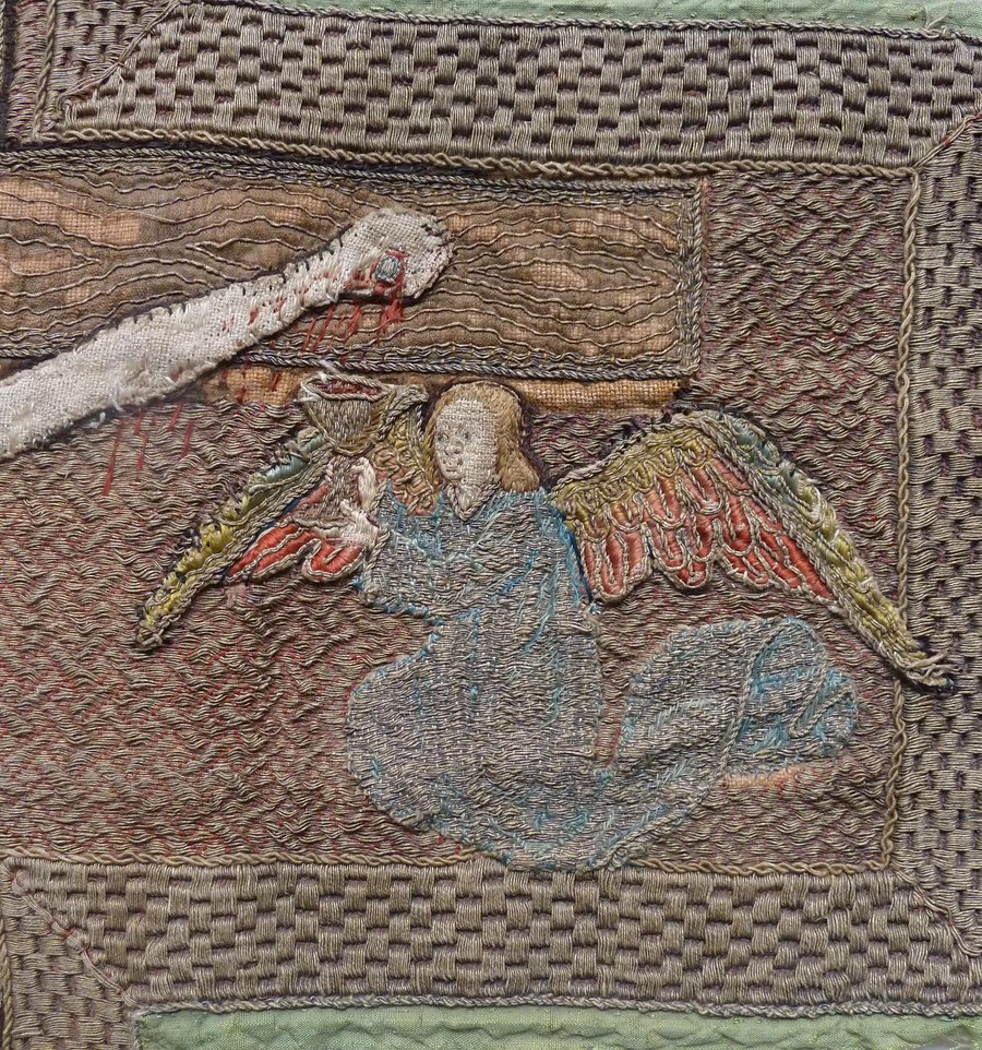 Op het kazuifelkruis wordt een Calvariescene afgebeeld. Centraal op een begroeide heuvel de gekruisigde Christus gekleed in een lendedoek. Vier engelen met uitwaaierende gewaden zweven om het kruis en vangen in kelken het heilig bloed uit de kruiswonden op. Boven Christus de tekst I.N.R.I., de H. Geest in de gedaante van een duif en God ...
