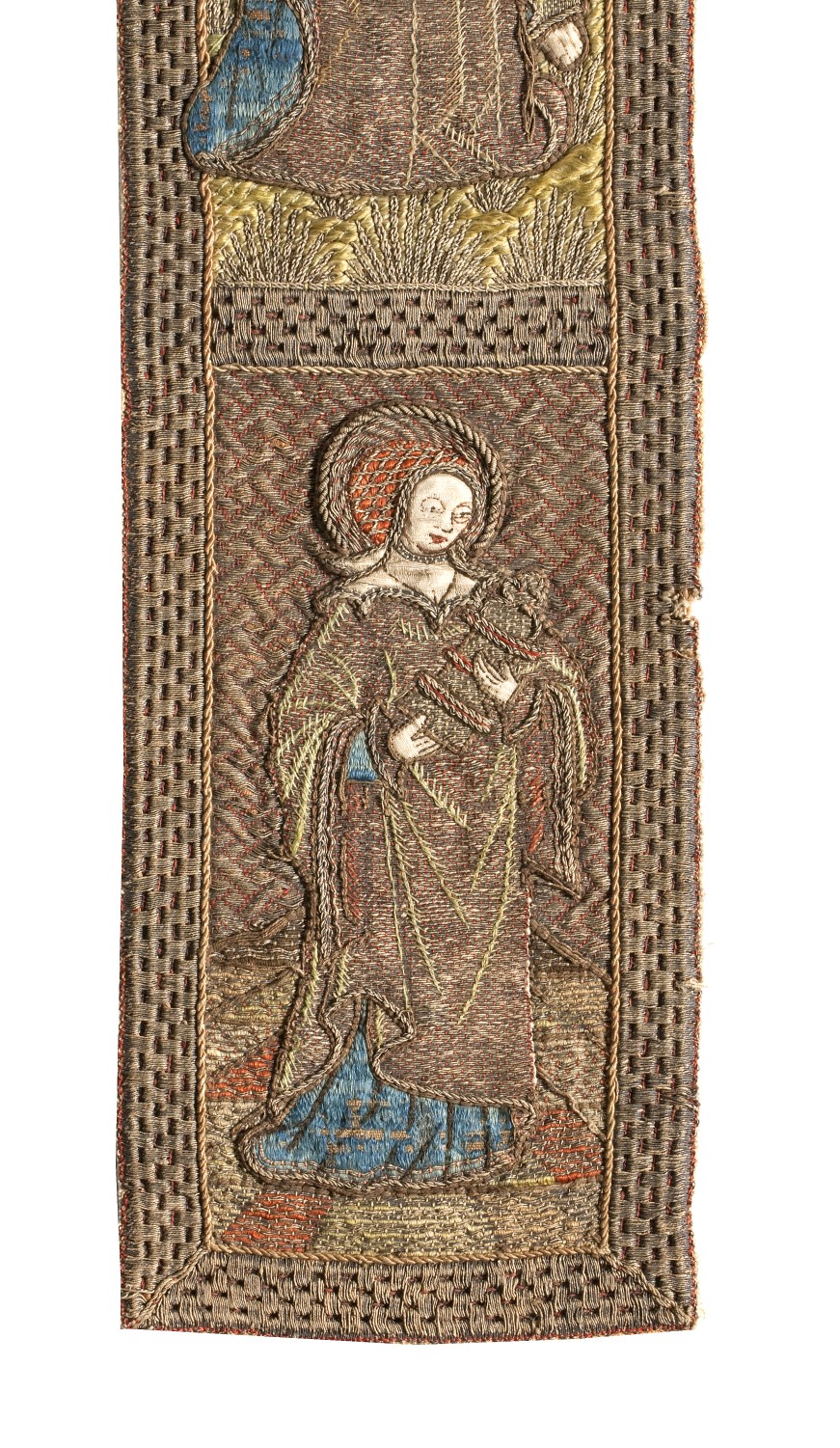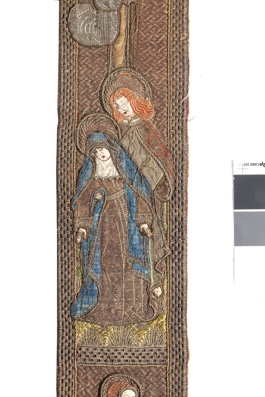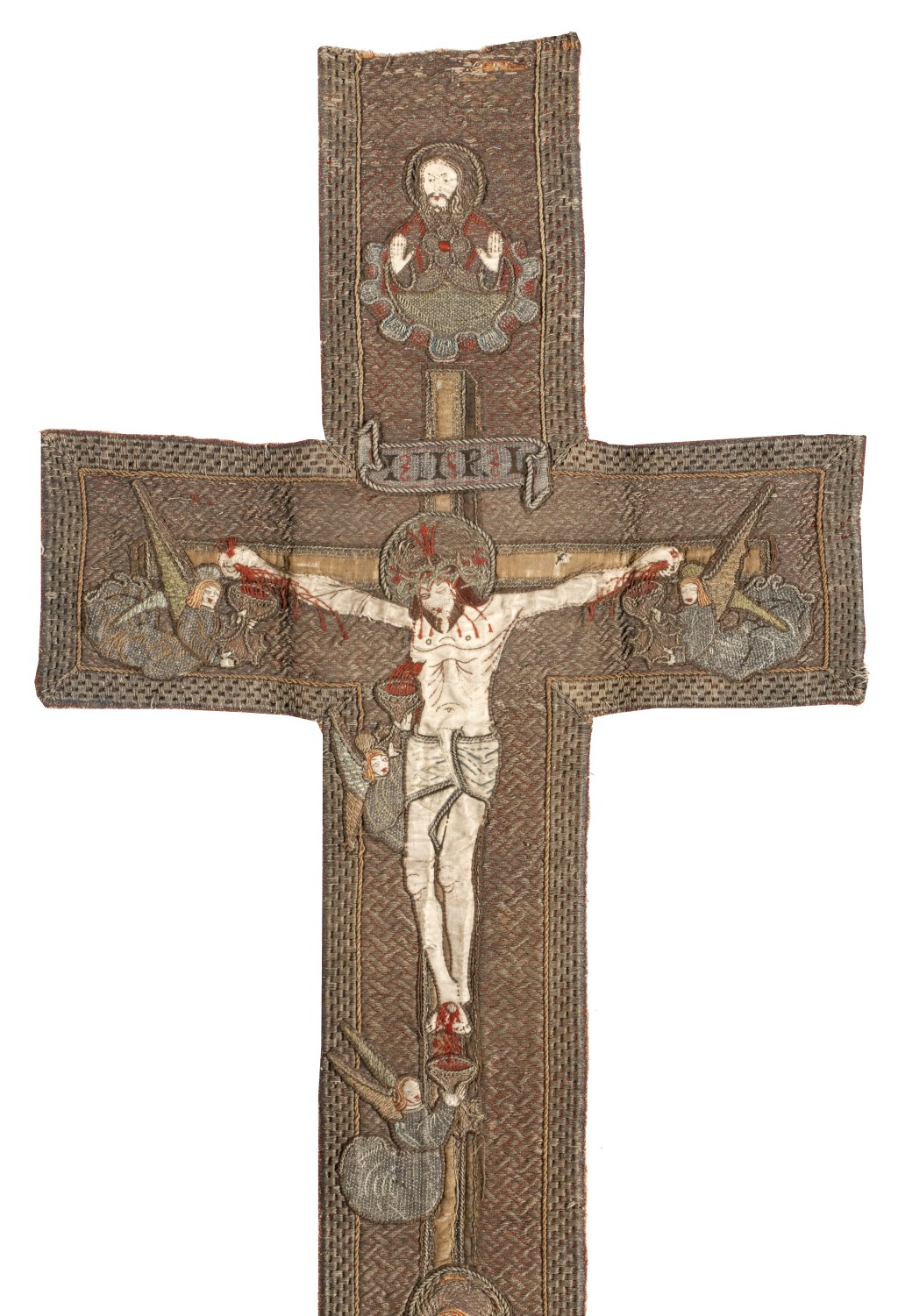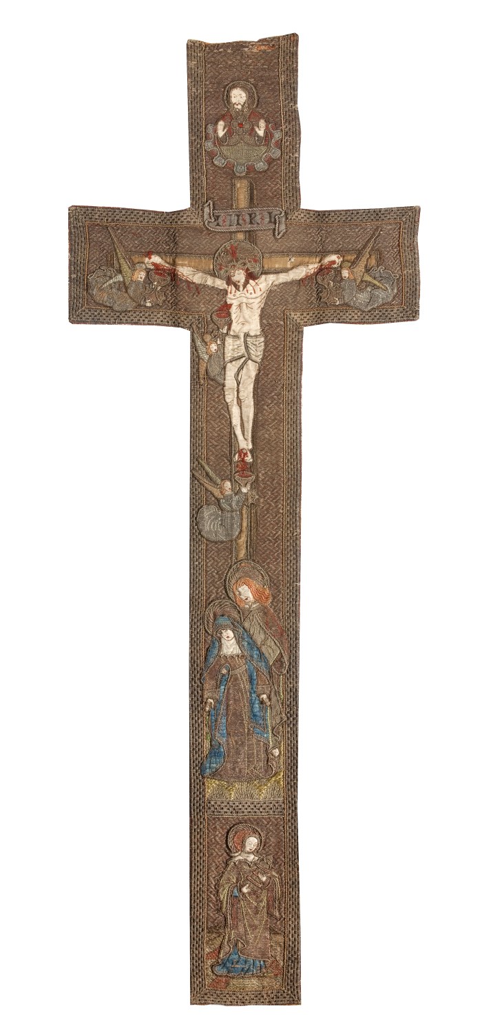 Op een achtergrond van gelegd gouddraad (huidjesgoud), gehecht in een wafeltjespatroon, wordt in latijnse kruisvorm een Calvariescène afgebeeld. Christus, gekleed in een lendedoek, hangt aan het kruis; om het kruis zweven in wolken vier engelen, die het heilig bloed uit de kruiswonden in kelken opvangen. Op de bovenste kruisbalk een banderolle met I.N.R.I, daarboven op ...