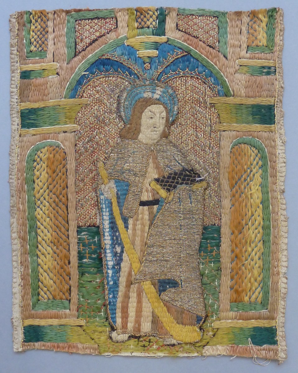 Op het borduurfragment wordt in eenzelfde architecturale ambiance als ABM t2157a de apostel Jacobus Minor afgebeeld, gekleed in lange tuniek met gordel en mantel. In de rechterhand houdt hij zijn attribuut, de knots, waarmee hij werd doodgeslagen; in de linker een gesloten boek Techniek: zie ABM t2157a