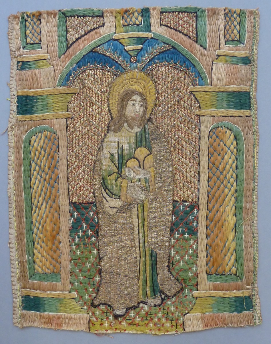 Op het borduurwerk wordt in eenzelfde architecturale ambiance als ABM t2157a de martelaar Stephanus uitgebeeld, gekleed in habijt en mantel met kraag. In de rechterhand houdt hij een gesloten boek; in de linker draagt hij zijn attributen, drie van de keien, waarmee hij werd gestenigd. Techniek: zie ABM t2157a