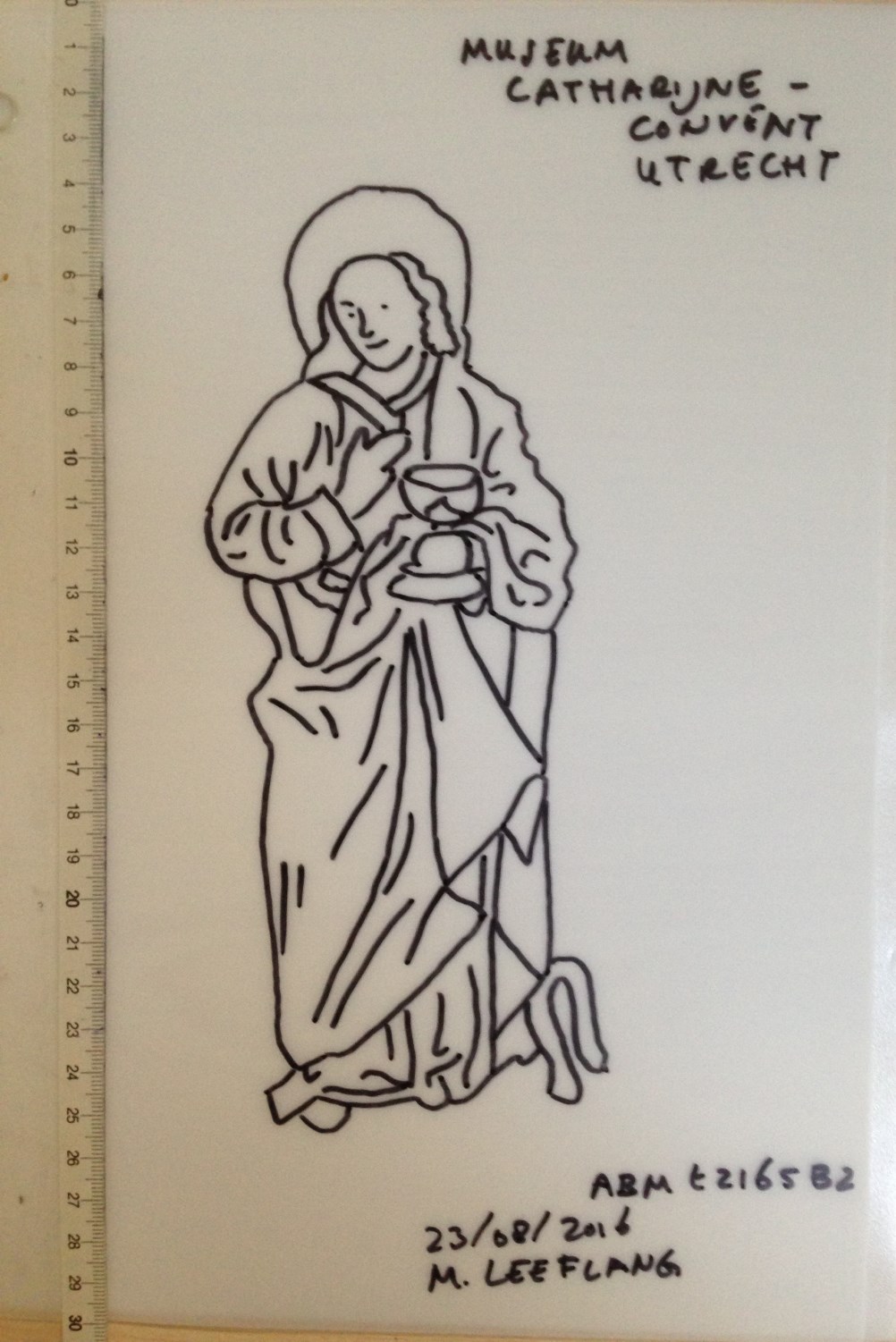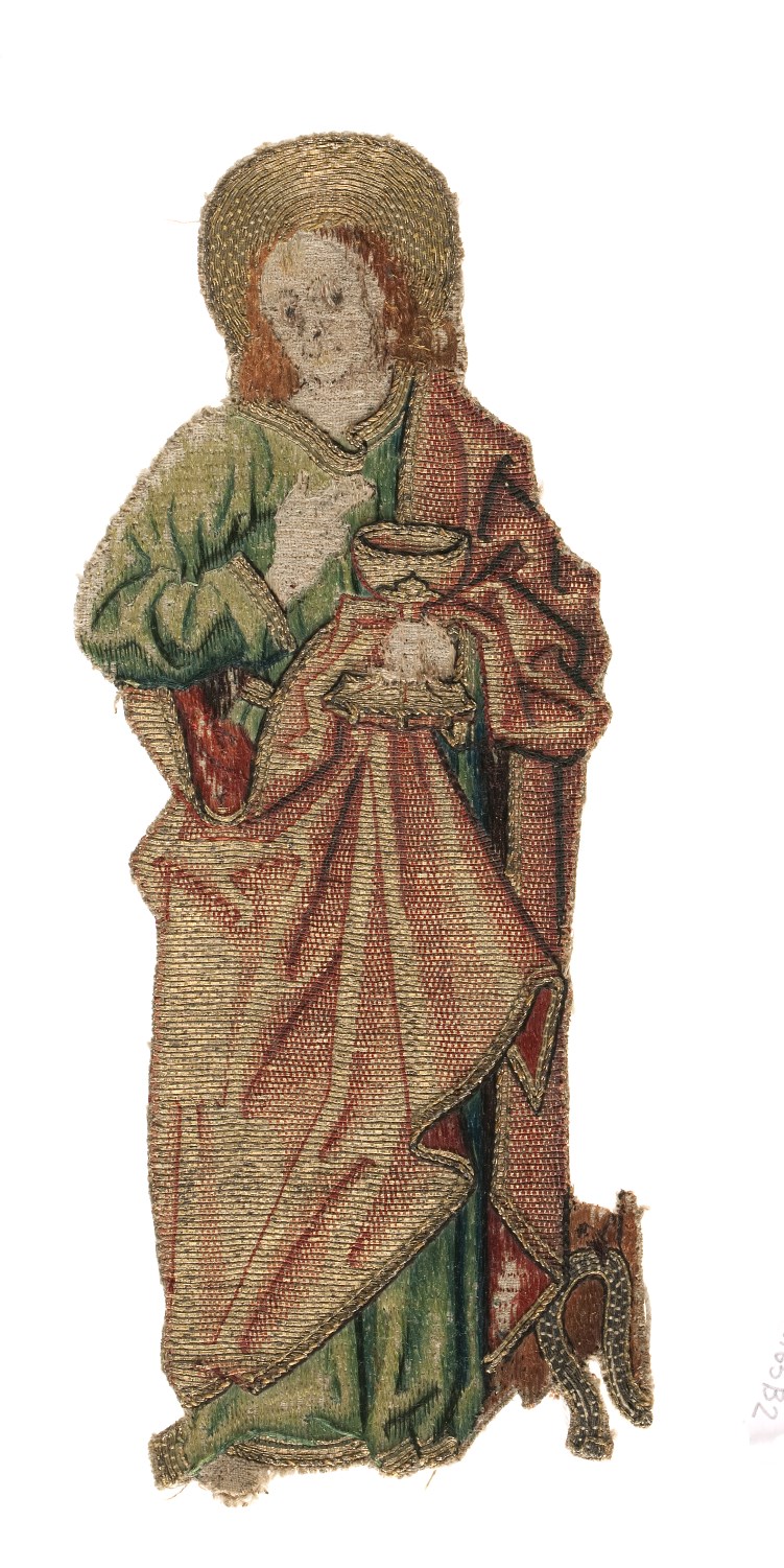 De losse Johannesfiguur heeft oorspronkelijk vastgezeten op ABM t2165b1. Samen met het aurifries ABM t2165a1 en het borduurfragment ABM t2165a2 heeft het deel uitgemaakt van het borduurwerk op de sierstrook van een dalmatiek. Johannes wordt afgebeeld in een ruimvallend gewaad en ruime mantel. Met de linkerhand houdt hij een kelk vast, welke hij met de ...