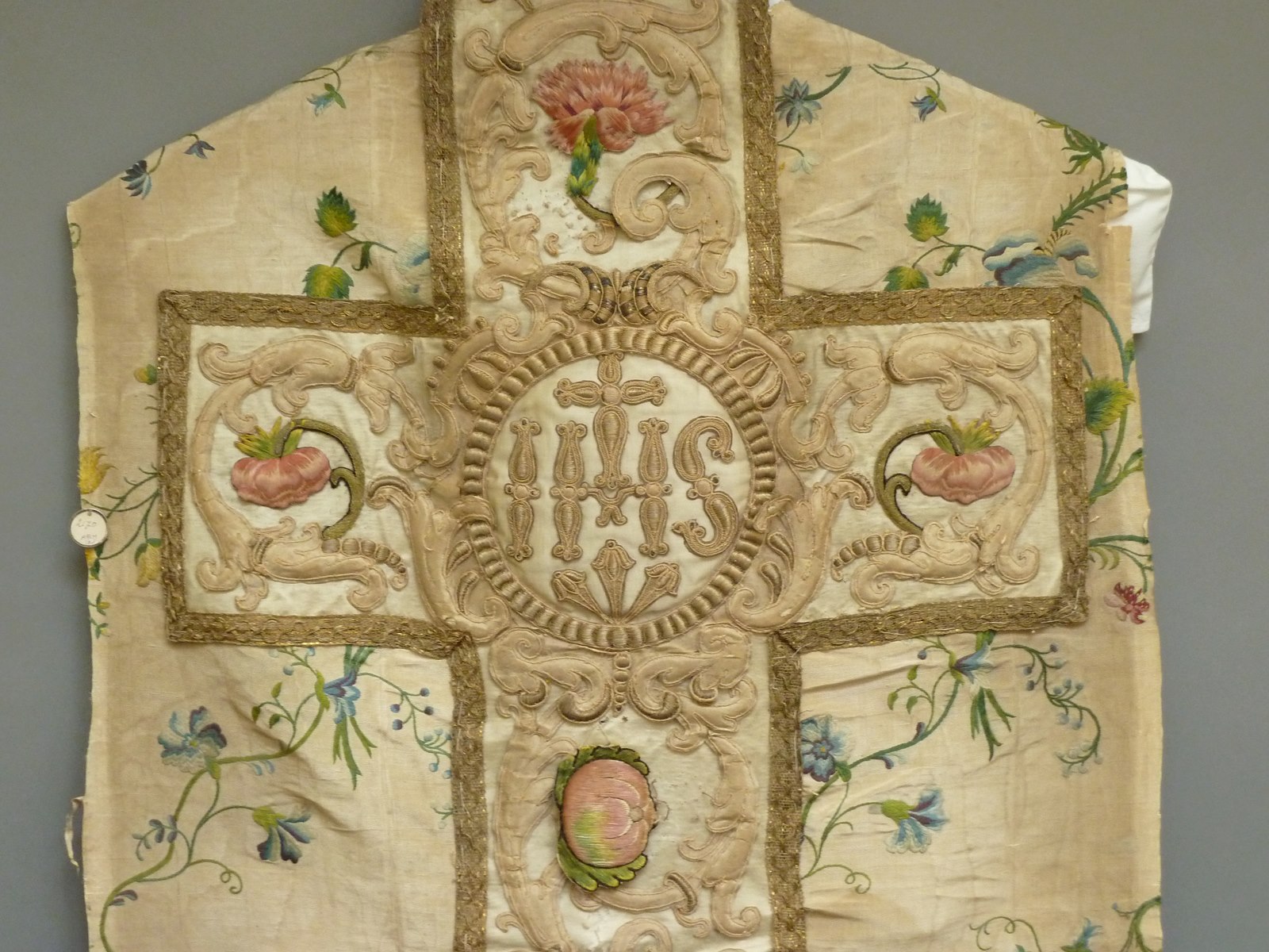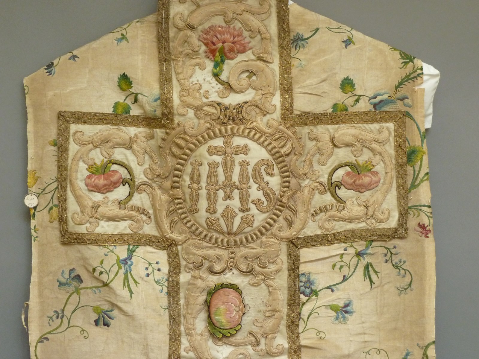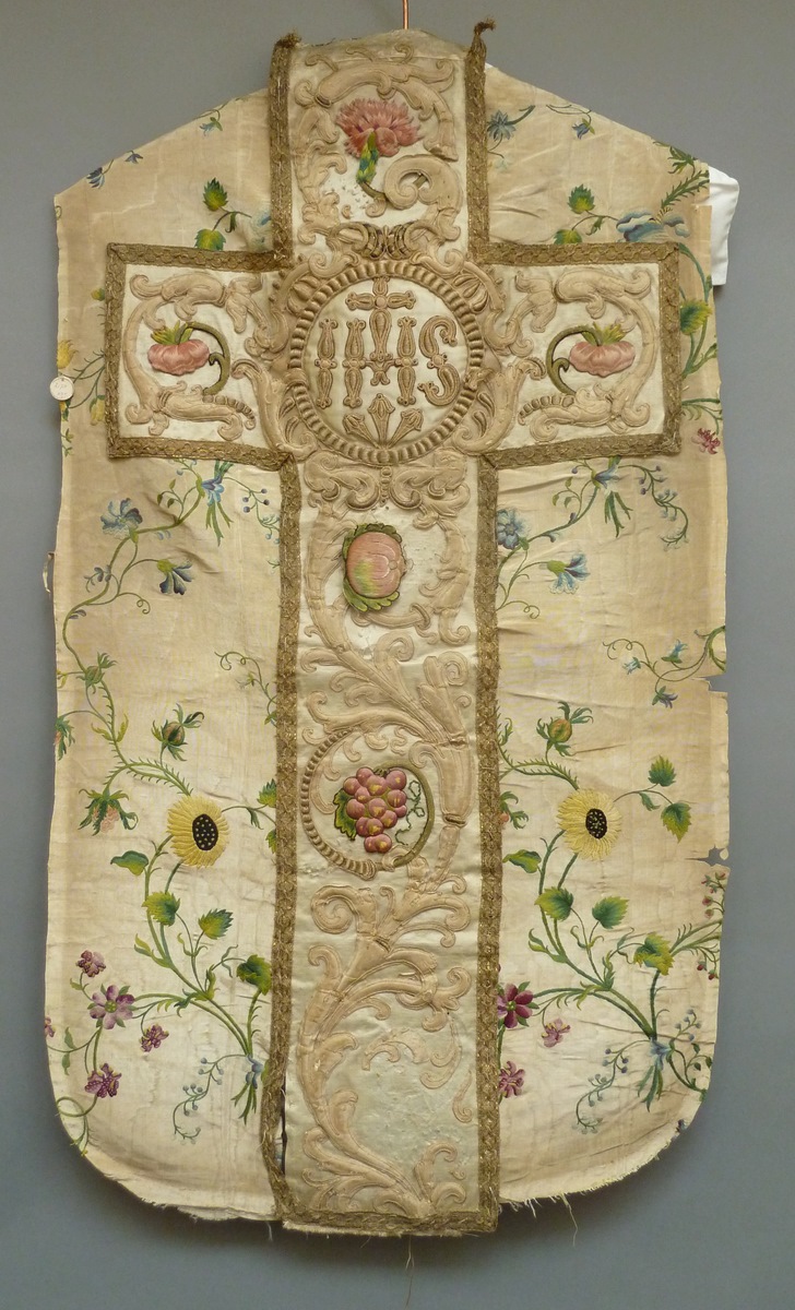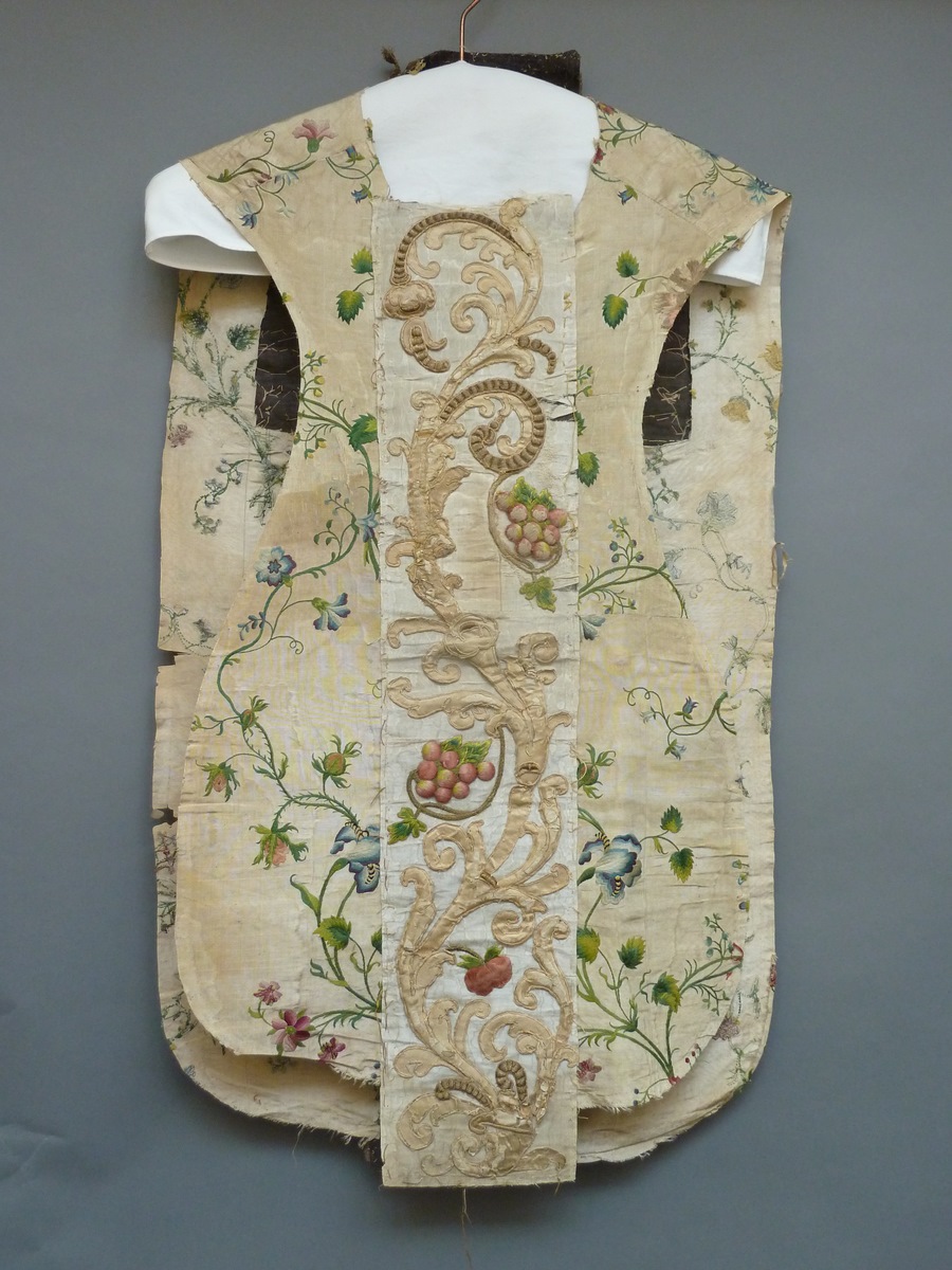 Wit kazuifel geborduurd met bloemranken van moiré-ripszijde met kruis met rinceaux