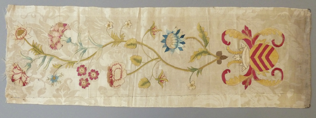 Fragment altaarrand, naturelkleurig met ingeweven bloempatroon en geborduurde bloemenrand