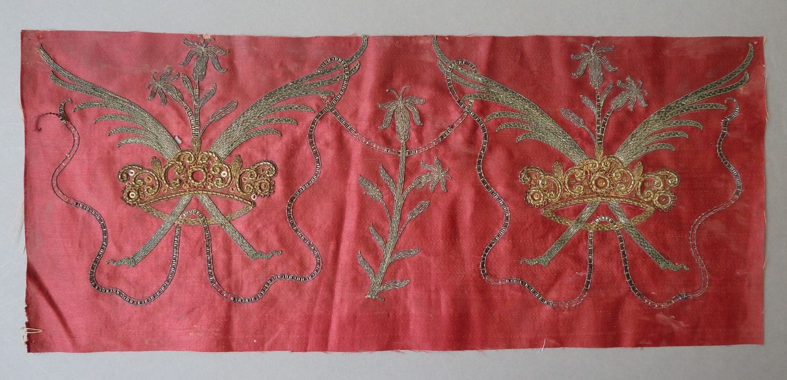 Fragment borduurwerk op rood satijn met twee omrankte kronen met palmen en lelietak