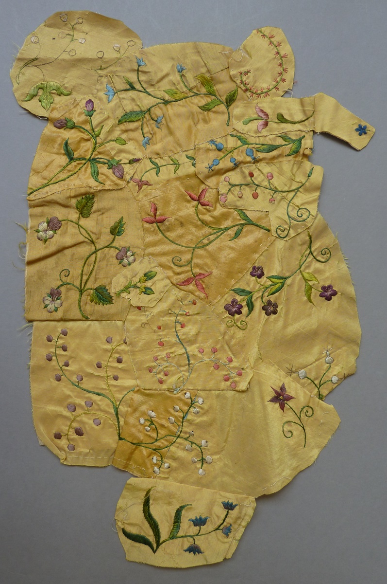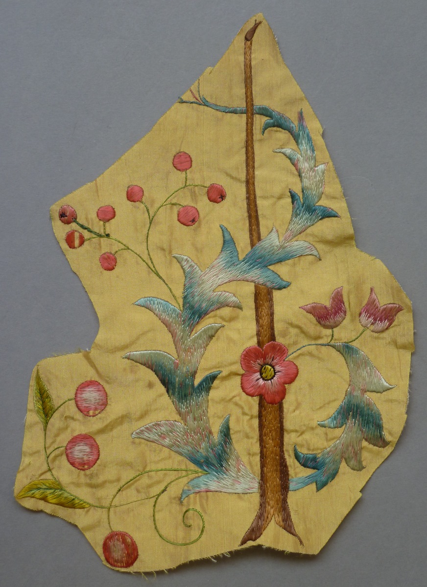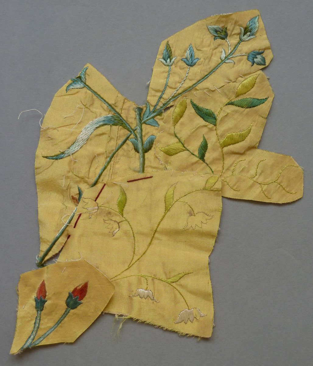 Fragmenten borduurwerk (7) Chinoiserie op geel fond met geborduurde bloemen, vogels en planten