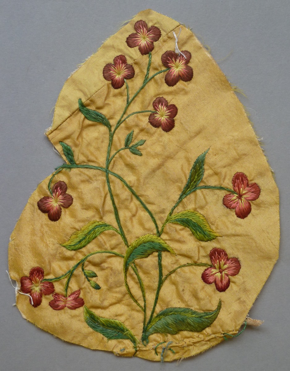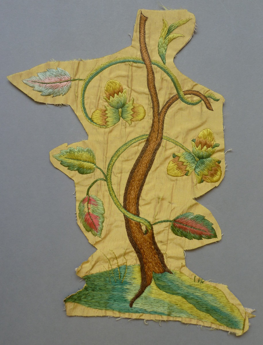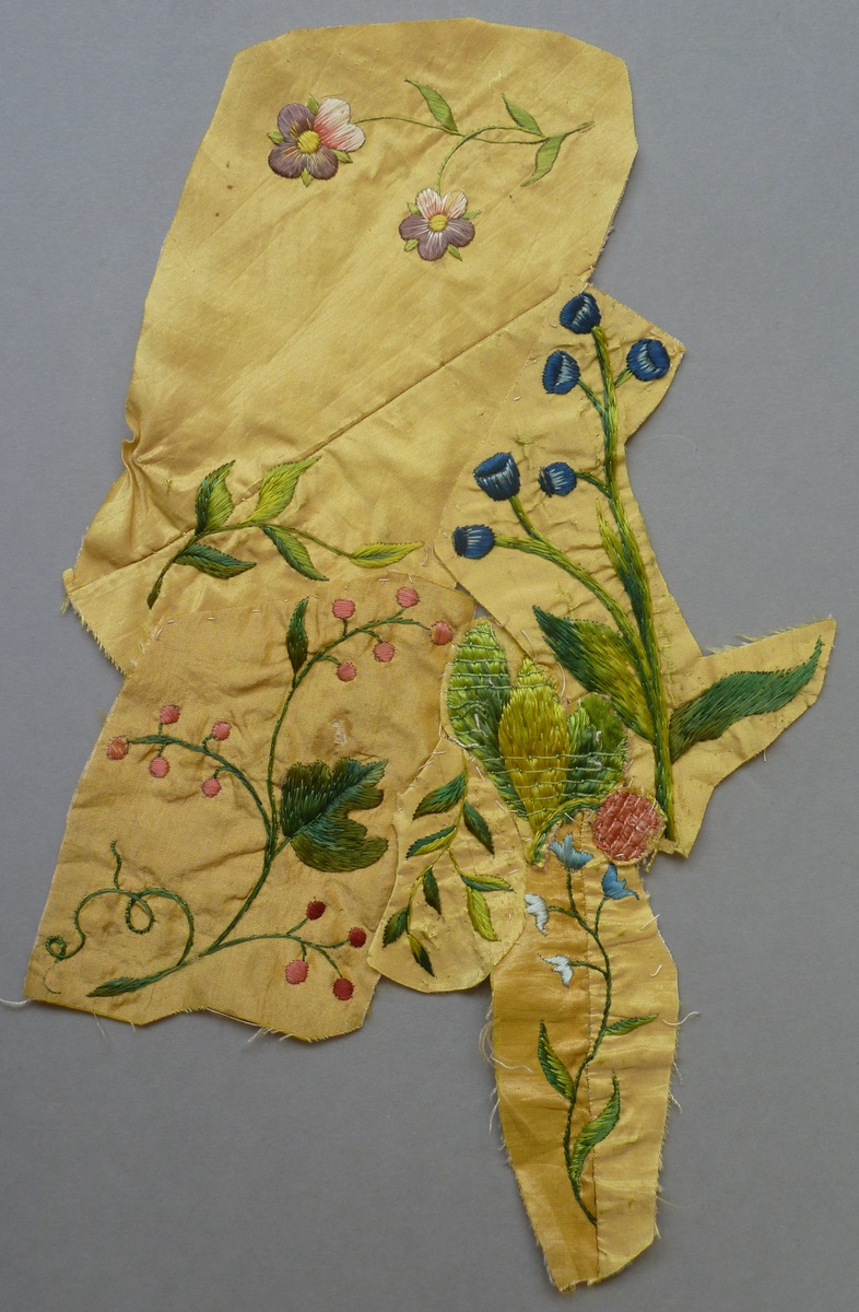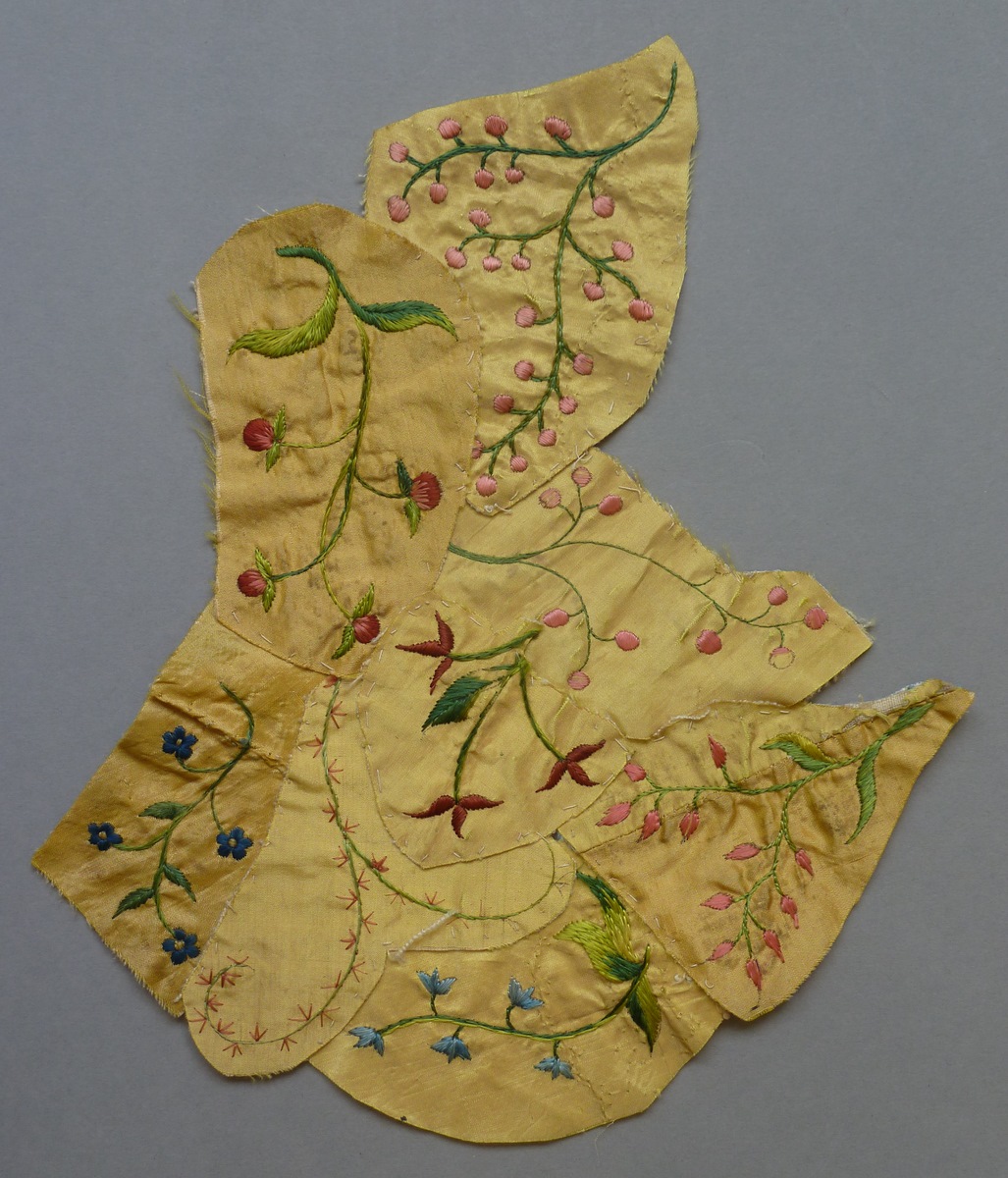 Fragmenten borduurwerk (7) Chinoiserie op geel fond met geborduurde bloemen, vogels en planten