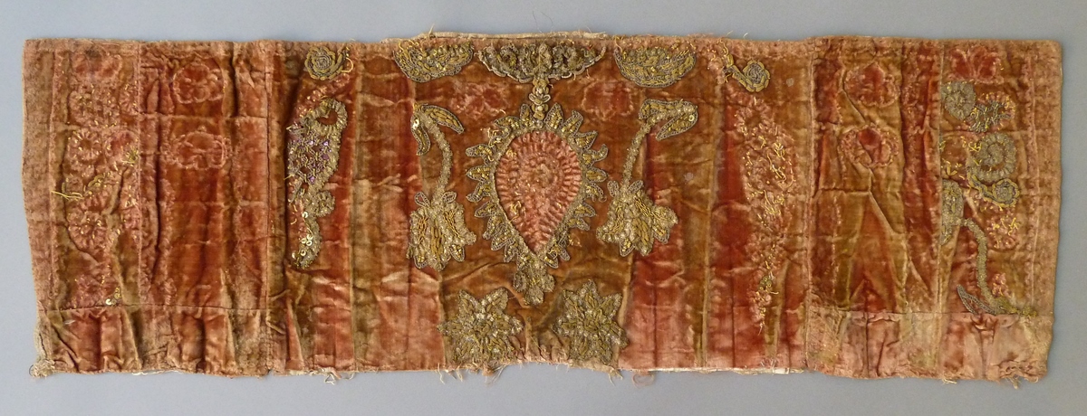 Fragment borduursel op roze fond met een granaatappel (monstrans?) en bloemenrozetten
