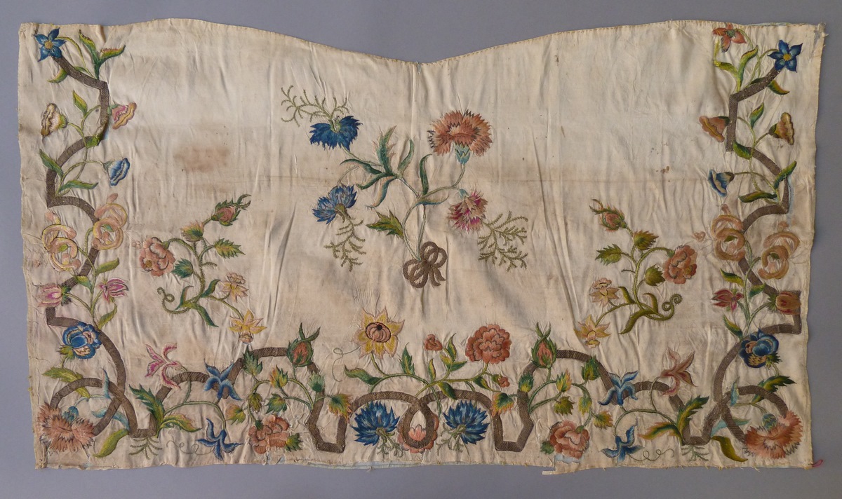 Borduursel op witte zijde (schoudermantel?) met rand van bloemen slingerend om gouden band