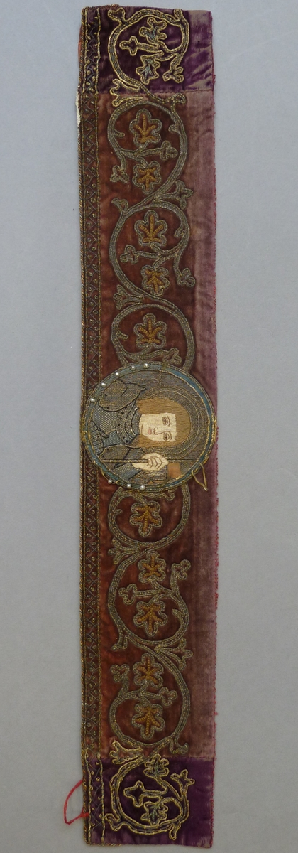 Op een smalle strook paarse fluweelzijde is centraal in een medaillon de buste van St. Joris geborduurd. Hij wordt tegen een gouden achtergrond afgebeeld als page, gaat gekleed in een harnas en draagt in de linkerhand een krijgsbanier (versneden). Links en rechts van het medaillon krullende ranken uitlopend in klimopbladeren. Aan de onderkant een smalle ...