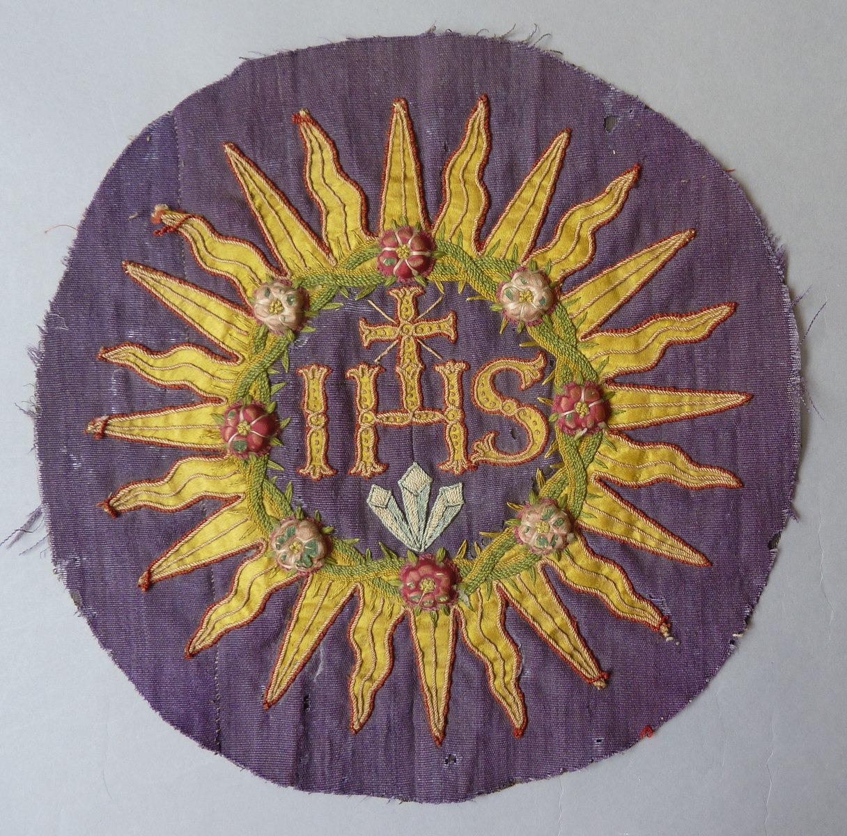 Paars medaillon met doornenkroon om I.H.S. omgeven door stralen