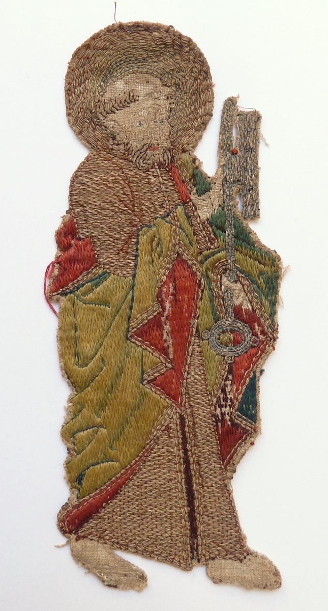Op het borduurfragment wordt ietwat naar rechts gewend de apostel Petrus afgebeeld, gehuld in onderkleed en ruime mantel. Hij houdt met beide handen een grote sleutel, zijn attribuut, vast. Techniek: het aureool, het onderkleed en de sleutel zijn van gelegd en met zijde gehecht gouddraad, de mantel is van gelegde zijde in ingrijpsteek. De nog ...