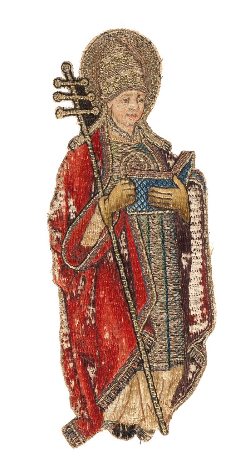 Op het borduurfragment wordt iets naar rechts gewend paus Gregorius afgebeeld. Hij gaat gekleed in een albe, dalmatiek en koorkap en draagt op het hoofd een tiara, en aan de handen handschoenen met in een punt uitlopende kappen. In de rechterhand houdt hij een gesloten boek, in de linkerhand de pauselijke staf met drie dwarsbalken. ...