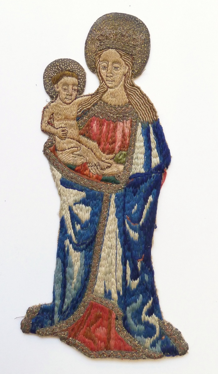 Op het borduurfragment worden Maria en het Christuskind afgebeeld. Maria, iets naar links gewend, is gehuld in een onderkleed en een bovenkleed met gouden zoom. Op het hoofd draagt ze een kroon. Ze draagt het naakte Christuskind op de rechterarm en ondersteunt zijn voetjes met de linkerarm. Techniek: de kleding en de lichaamspartijen zijn van ...