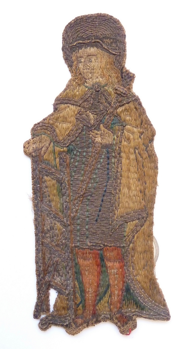 Op het borduurfragment wordt de Romeinse heilige en bedelaar Alexius afgebeeld. Hij gaat gekleed in een ondergewaad, mantel en kousen. In de rechterhand houdt hij de bedelstaf. Achter hem zijn attribuut, de ladder. Techniek: het aureool, het onderkleed en de zomen van de mantel zijn van gelegd en met zijde gehecht gouddraad. De mantel, de ...