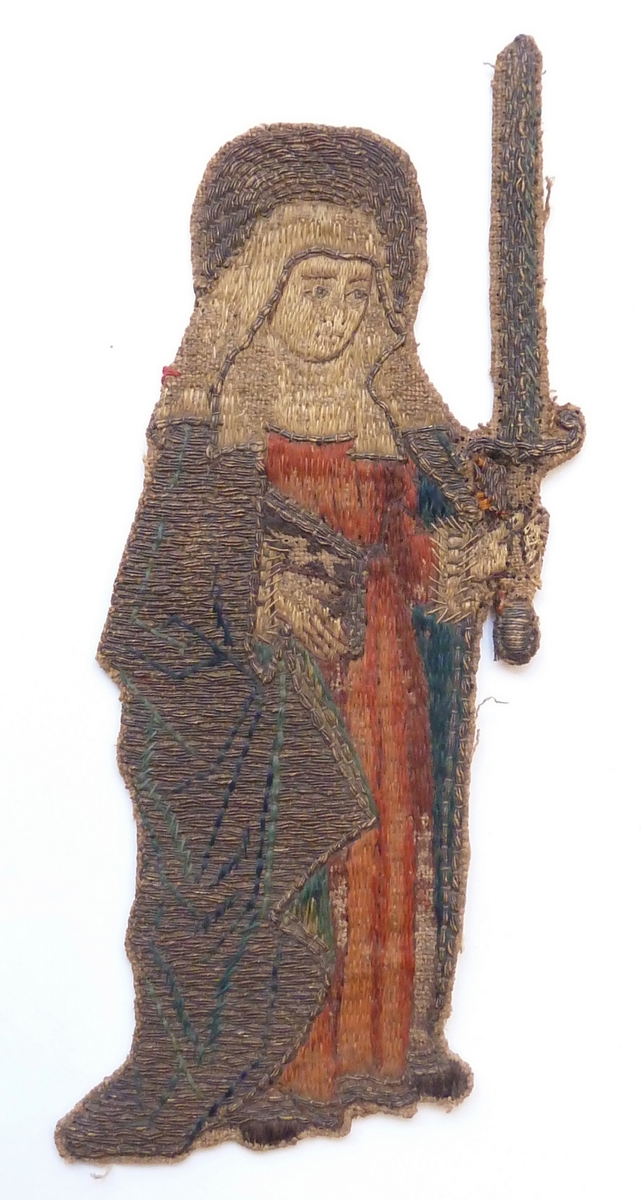 Op het borduurfragment wordt de H. Lucia afgebeeld. Ze gaat gekleed in gewaad en mantel en draagt een kinnedoek en sluier. In de rechterhand houdt ze een boek, in de linker heft ze haar attribuut, het zwaard, op. Techniek: zwaard, boek en mantel zijn van gelegd en met zijde gehecht goudraad (huidjesgoud), de laatste in ...