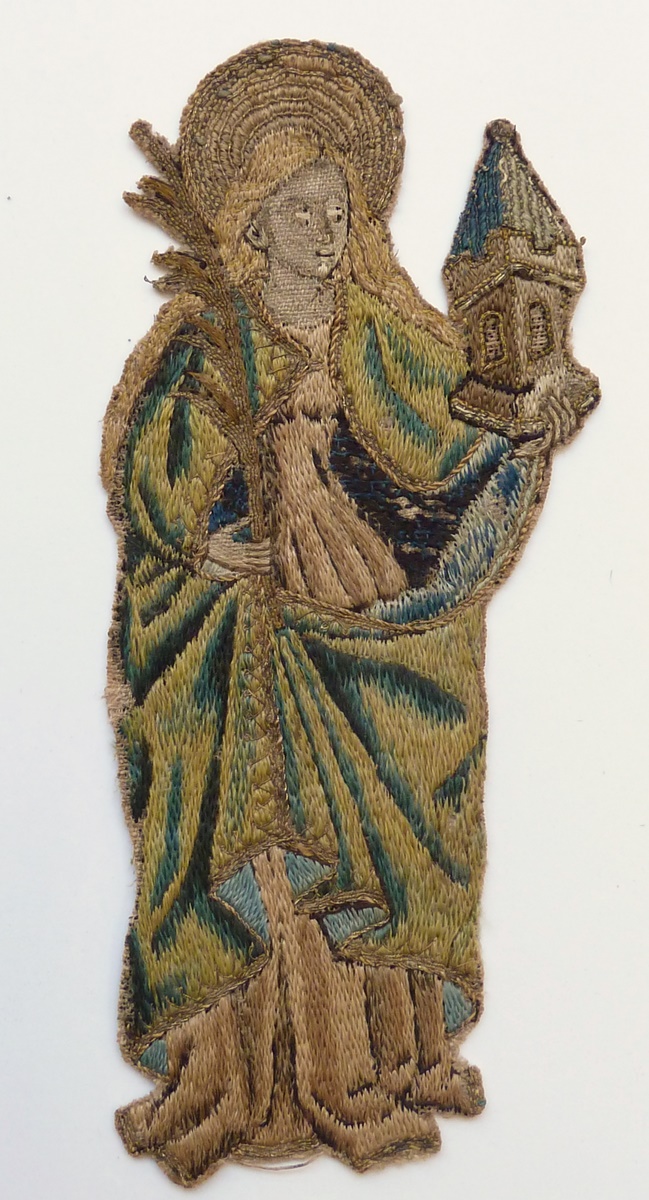 Op het fragment wordt de H. Barbara uitgebeeld. Zij is gekleed in een gewaad met nauwsluitend bovenlijf en mantel met gouden zoom. In de linkerhand houdt zij haar attribuut, de toren, in de rechter een palmtak. Techniek: de toren, de nimbus, de palmtak en de mantelzoom zijn van gelegd en met zijde gehecht gouddraad. De ...