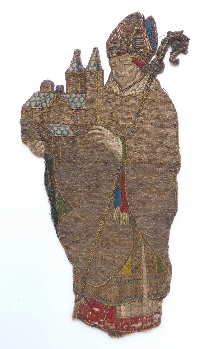 Op het borduurwerk wordt bisschop Koenraad afgebeeld. Hij draagt een albe met gekleurde rand, een dalmatiek, een koorkap en een mijter. De bisschopsstaf rust tegen zijn linkerschouder. In de rechterhand houdt hij het model van een romaanse kerk met twee torens, dat hij met de rechterhand zegent. Aan zijn rechterpols hangt een manipel. Techniek: het ...