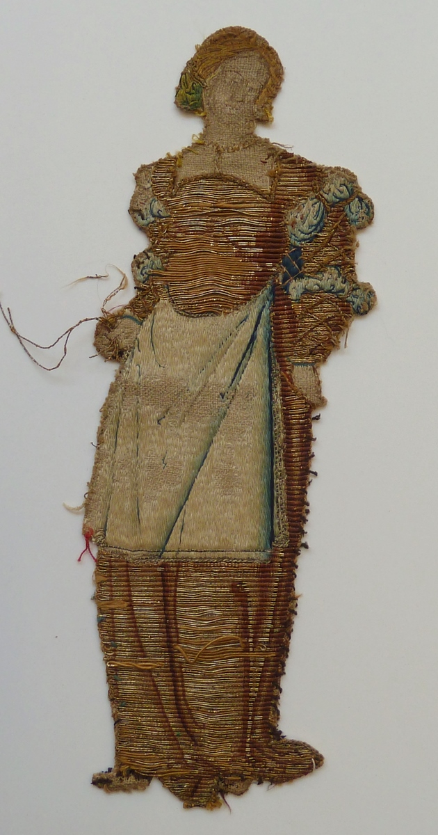 Op het borduurfragment wordt een niet te identificeren vrouwelijke heilige afgebeeld. Ze staat in een lichte S-curve en in gekleed in een eigentijds gewaad: een lange japon met wijde rok, nauwsluitend lijfje met vierkante halsuitsnijding en mouwen versierd met poefjes. Om het middel is een voorschoot. Om haar hals een gouden ketting. Het haar is ...
