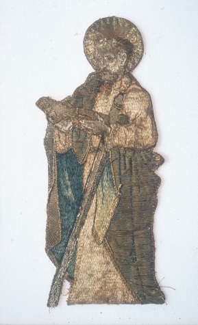 Op het aan de onderkant versneden borduurfragment wordt de gebaarde en enigszins kalende apostel Paulus afgebeeld. Hij gaat gekleed in een onderkleed en mantel, welke deels over de rechterschouder hangt, deels onder de linkerarm wordt vastgeklemd evenals zijn attribuut, het zwaard. Hij houdt met beide handen een opengeslagen boek vast. Techniek: het onderkleed, het gezicht ...