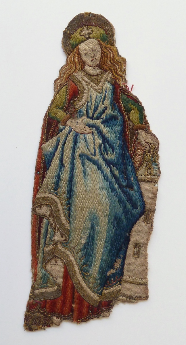 Het borduurfragment stelt de H. Barbara voor. Ze draagt een onderkleed met ronde halsopening, waaruit met bont afgezette mouwen komen, een ruimvallend bovenkleed met V-hals en een muts met vierpasornament. Met de linkerhand steunt ze op haar attribuut, de toren. Techniek: de randen van de kleding en toren zijn versierd met gelegd en met zijde ...