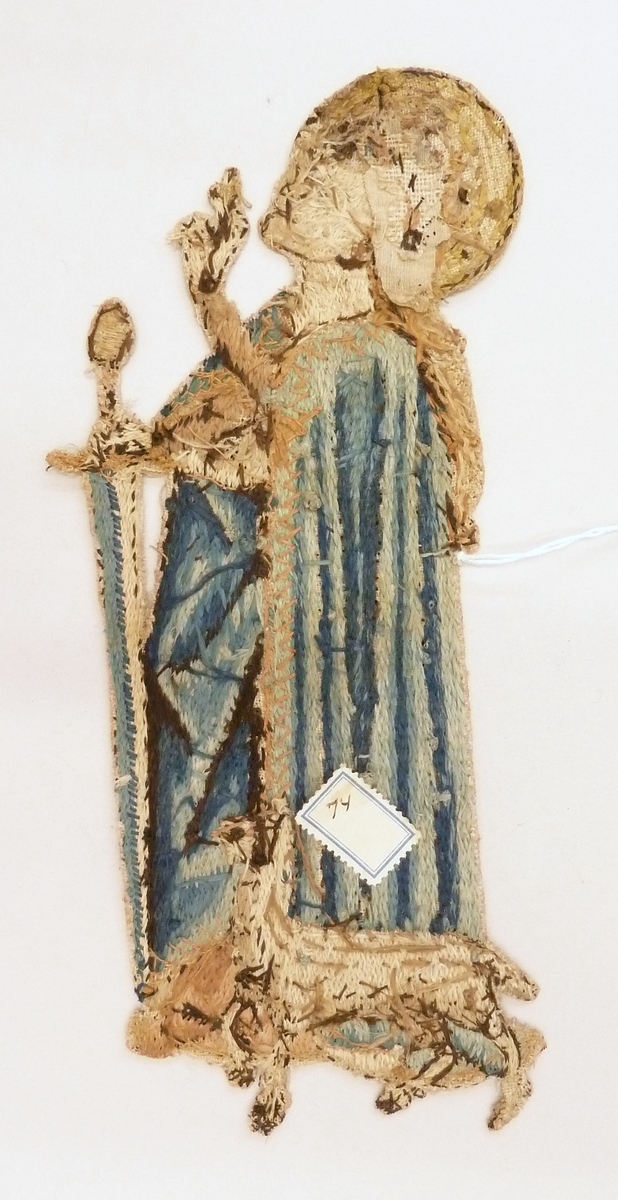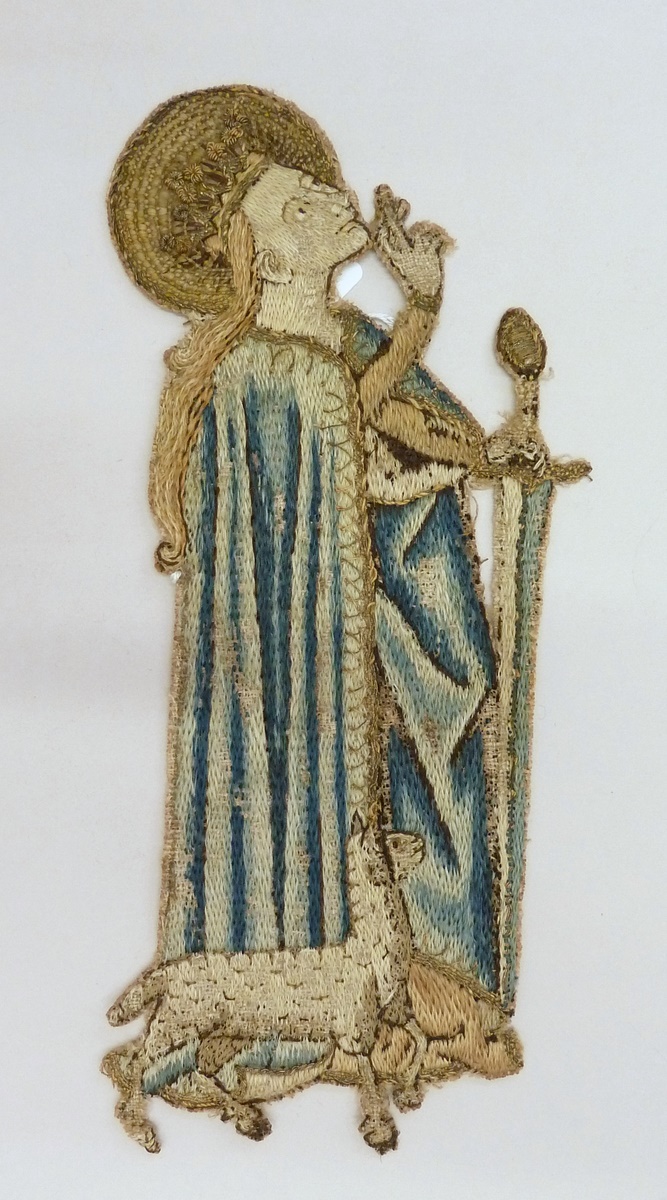 Op het borduurwerk wordt de H. Agnes afgebeeld, zich naar rechts wendend. Ze houdt het hoofd achterover en kijkt omhoog, terwijl ze met haar linkerhand naar boven wijst. Met de rechterhand steunt ze op het zwaard; aan haar voeten haar attribuut, het lam. Ze is gehuld in een onderkleed met lange mouwen en een mantel ...