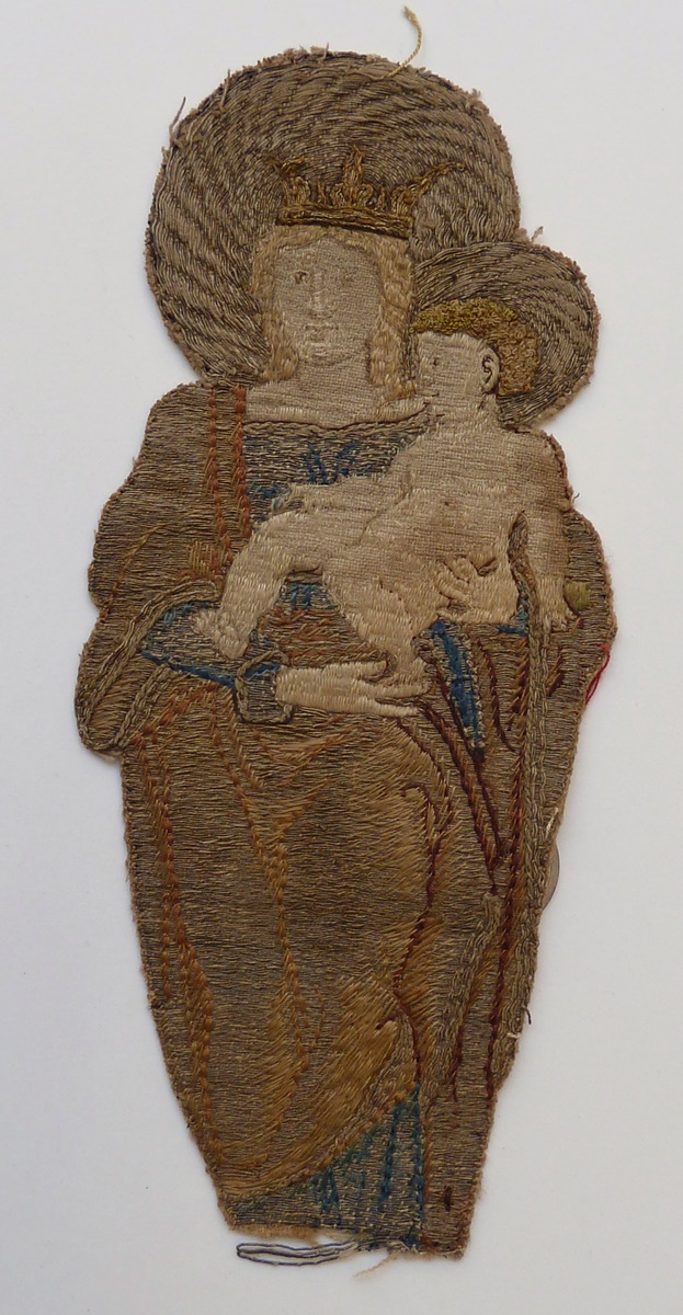 Het borduurfragment stelt en face een Maria met Christuskind voor. De madonna draagt een gewaad met wijde mantel en op het hoofd een kroon. Ze draagt het naakte Christuskind op de linkerarm, met de rechter ondersteunt ze de voetjes. Het fragment is bij de voeten versneden. Techniek: het gewaad en de voering van de mantel ...