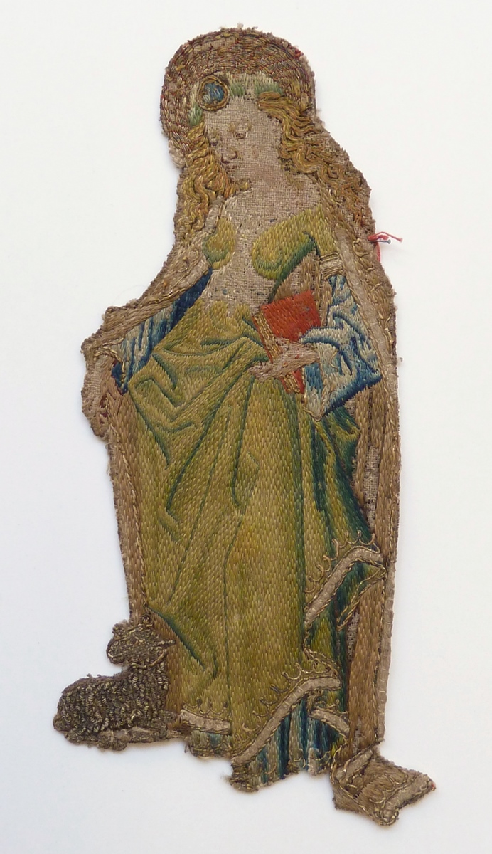 Het borduurfragment stelt de H. Agnes voor. Ze gaat gekleed in een gewaad met nauwsluitend lijfje, een bovenkleed en mantel met gouden rand. Op het hoofd draagt ze een muts met cirkelvormig ornament, en in de linkerhand een boek. Rechts houdt ze haar attribuut, het aan haar voeten gelegen lam, aan de lijn. Techniek: de ...
