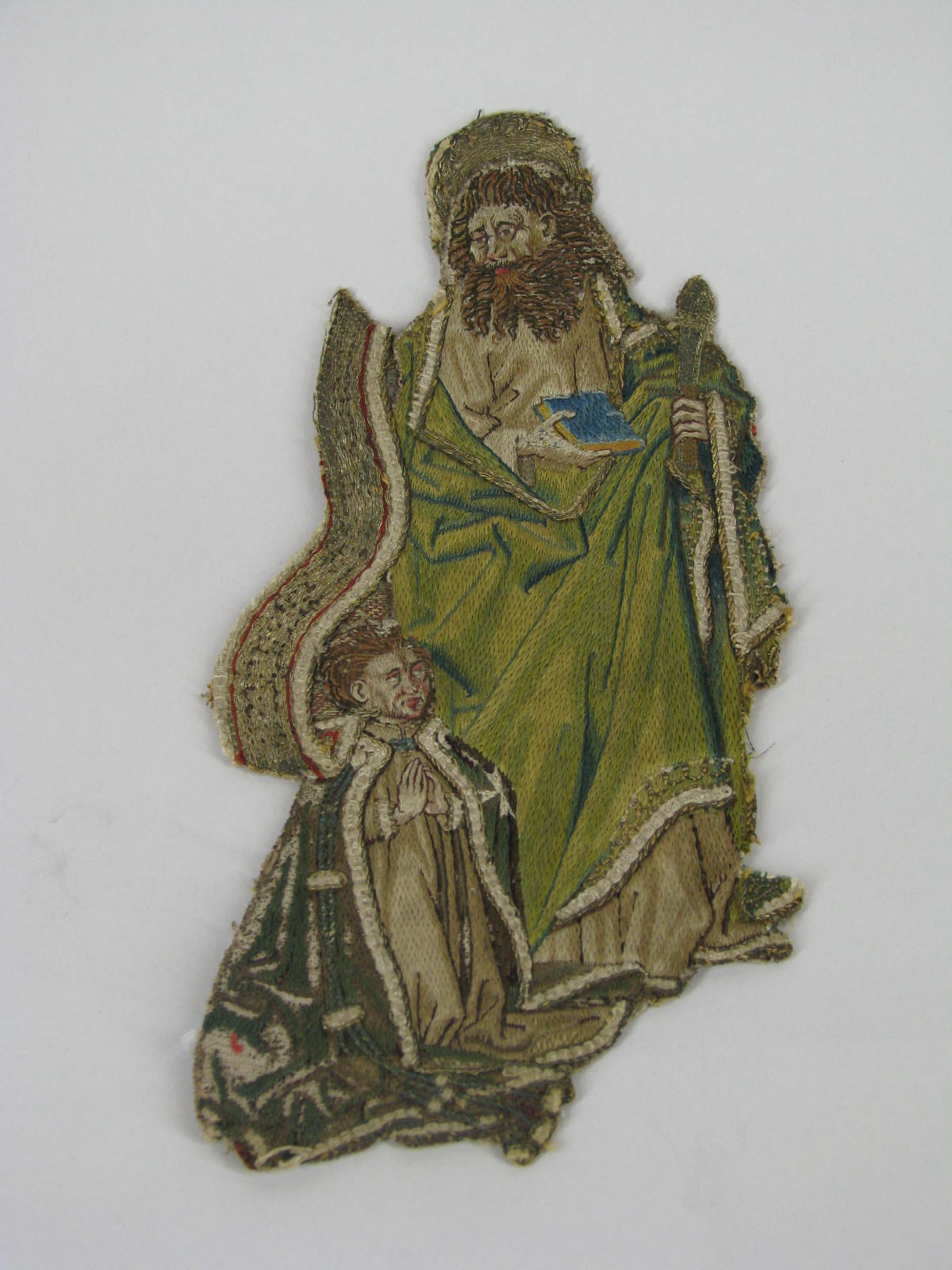 Op het borduurfragment worden een bebaarde Johannes de Doper en een Johannieter afgebeeld. Johannes gaat gekleed in onderkleed en pallium. In de linkerhand houdt hij een gesloten boek, rechts een niet te duiden attribuut. Links aan zijn voeten knielt een Johannieter ridder gekleed in onderkleed en bruine mantel met hermelijnen boorden, op de linkerschouder voorzien ...