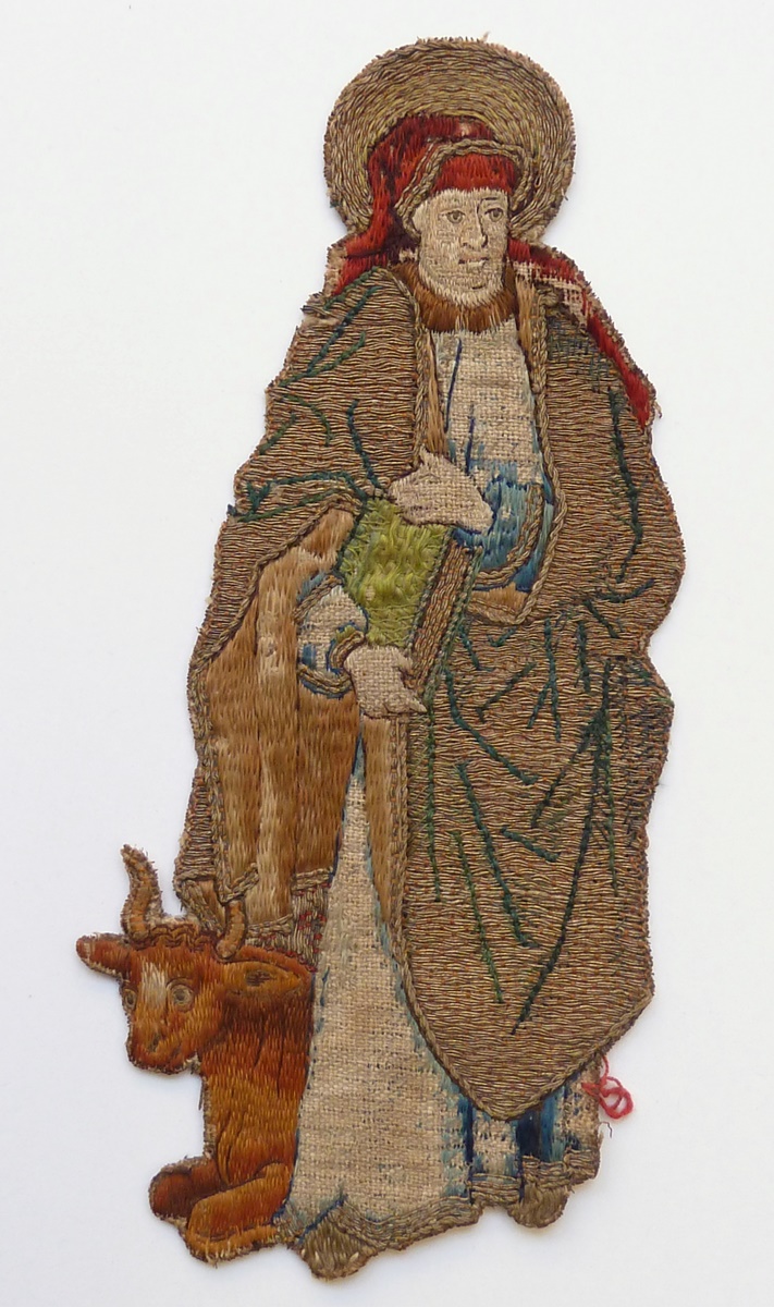 Op het borduurfragment wordt de evangelist Lucas uitgebeeld. Hij gaat gekleed in een onderkleed en ruime mantel, op het hoofd draagt hij een muts. Hij houdt met beide handen een groot boek vast. Aan zijn voeten links zijn attribuut, de os. Techniek: de mantel en het aureool zijn van gelegd en met zijde gehecht gouddraad. ...