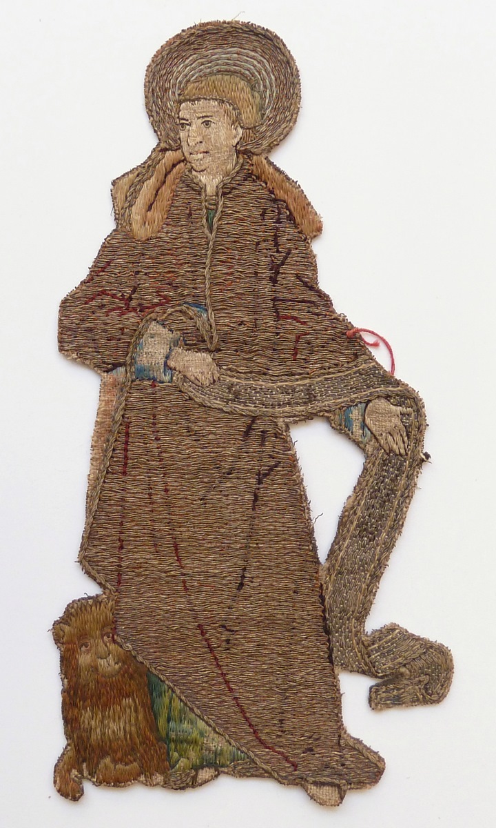 Op het fragment wordt de evangelist Marcus uitgebeeld. Hij gaat gekleed in een onderkleed en mantel met capuchon. Op het hoofd draagt hij een kapje. Hij houdt met beide handen een banderol vast, waarvan de tekst niet meer leesbaar is. Links aan zijn voeten ligt de leeuw, zijn attribuut. Techniek: de mantel is van gelegd ...