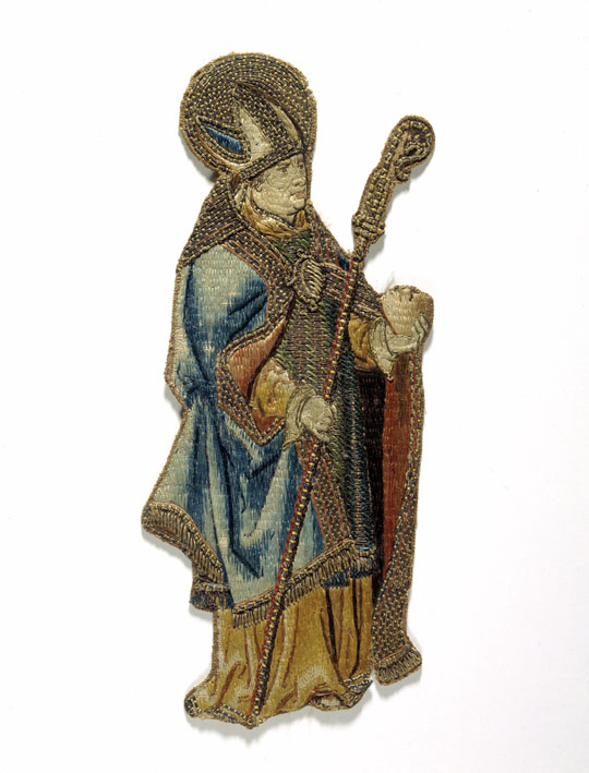 Op het borduurfragment wordt de kerkvader Augustinus afgebeeld. Hij gaat gekleed als bisschop in een albe, dalmatiek en koormantel met agrafe. Op het hoofd draagt hij een mijter. In de rechterhand houdt hij de bisschopsstaf, in de linker zijn attribuut, een hart. Techniek: zie ABM t2194.90. Staat: de lichtgekleurde zijde van gezicht, handen en albe ...