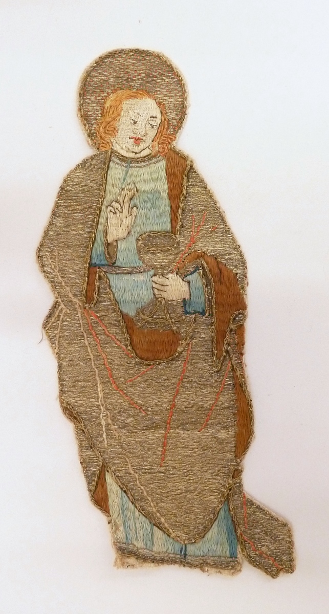 Op het borduurfragment wordt de evangelist Johannes uitgebeeld.