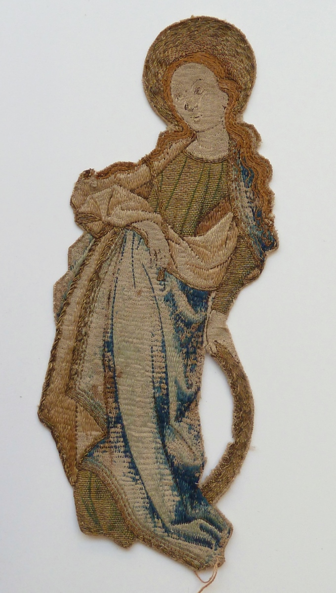 Op het borduurfragment wordt de H. Catharina uitgebeeld, het lichaam in een sierlijke s-curve. Ze gaat gekleed in een onderkleed met ronde halsuitsnijding, waaroverheen een mantel is gedrapeerd die deels over haar rechterarm hangt. Met de linkerhand steunt ze op haar attribuut, het rad, waarvan de spaken verdwenen zijn. In de rechter houdt ze een ...