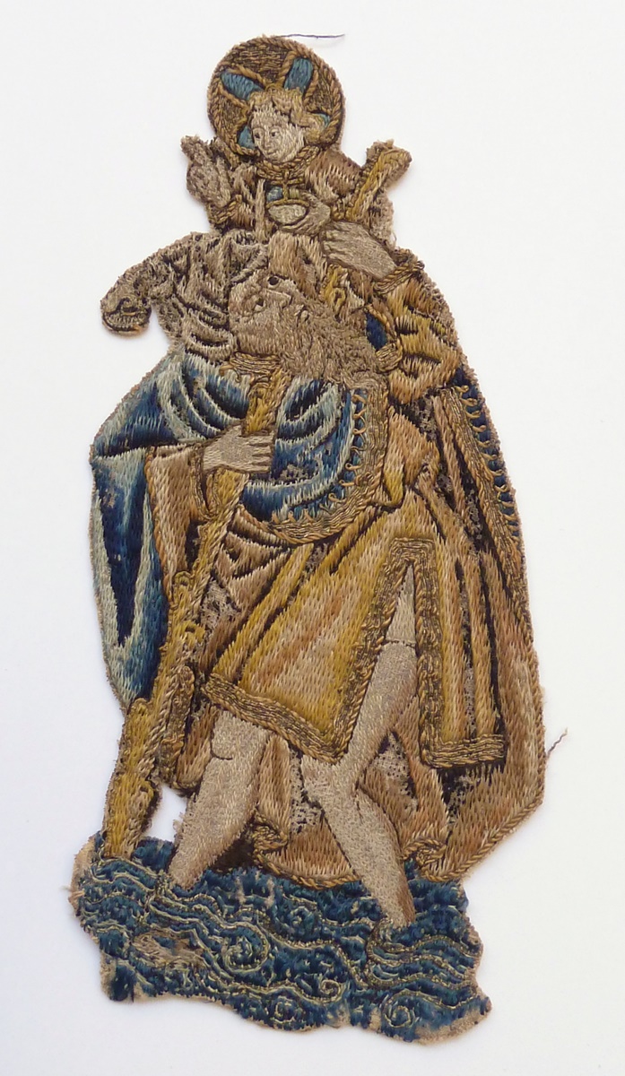 Op het borduurfragment wordt St. Christoffel afgebeeld met het Christuskind op de schouders. Christoffel, gehuld in tuniek en mantel en met een geplooide puntmuts op het hoofd, waadt steunend op een stok blootvoets door de golven van een rivier. Hij kijkt op naar het Christuskind, dat de rechterhand in een zegenend gebaar opheft; in de ...