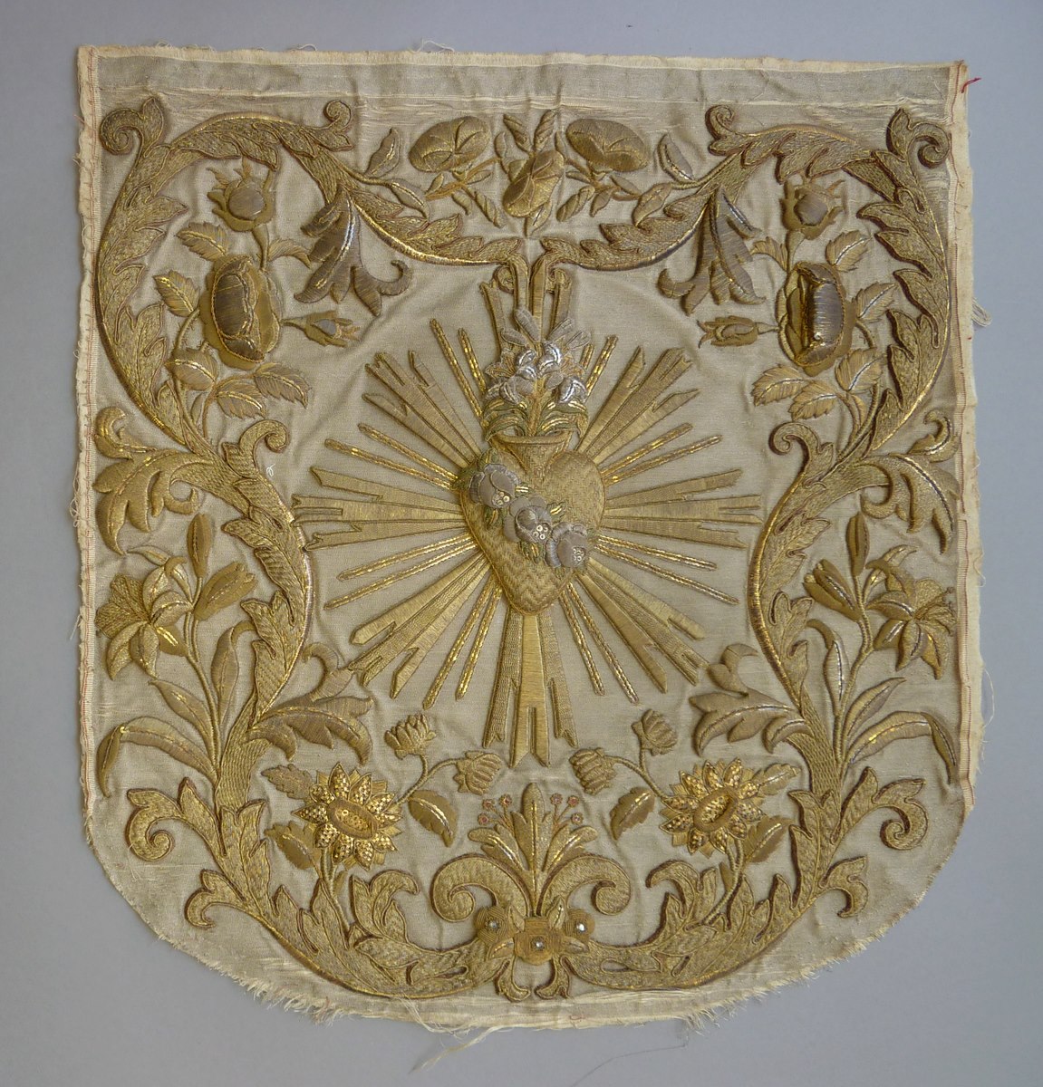 Koorkapschild van zilverlaken met hart met stralenkrans in bloemenkrans met rinceaux