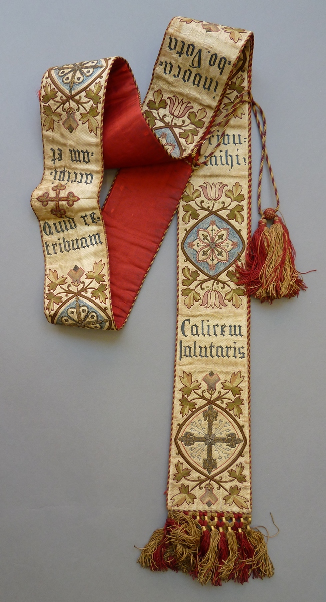 Witte stola (ecru) met tekst en ruitvormige versieringen met bloemen