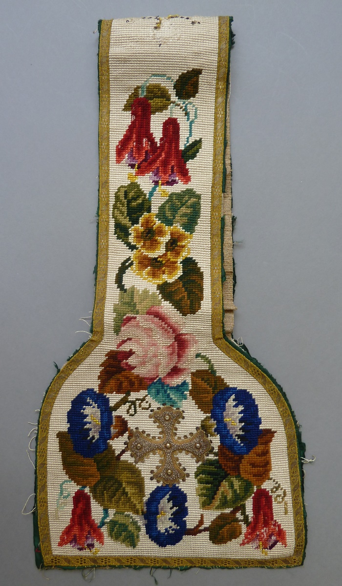 Witte manipel met veelkleurig geborduurde bloemranken en kruisjes van gehoogd gouddraad