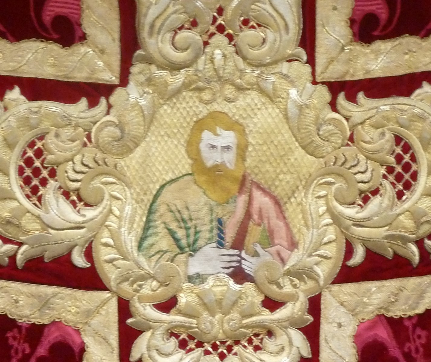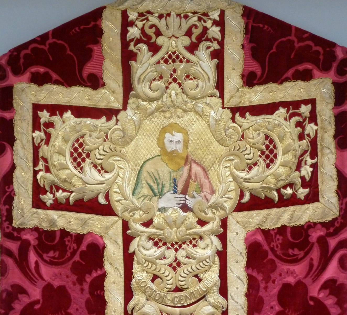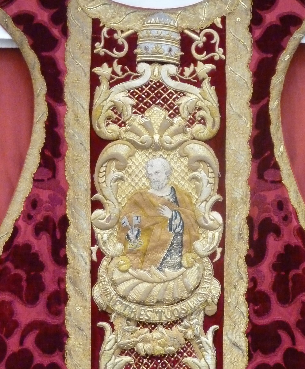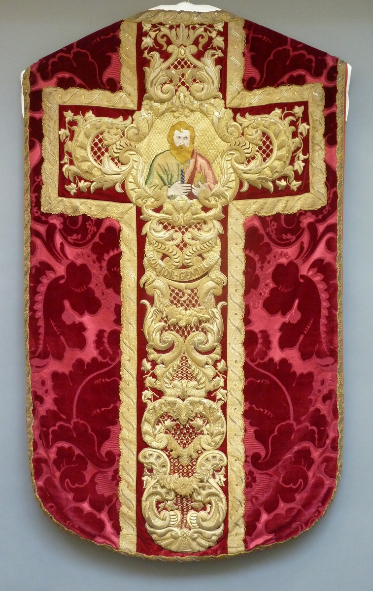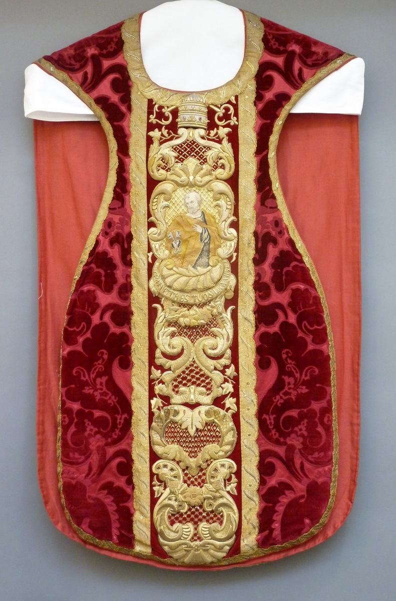Rood kazuifel met ingeweven motief van gestyleerde bladeren en bloemen en H. Petrus