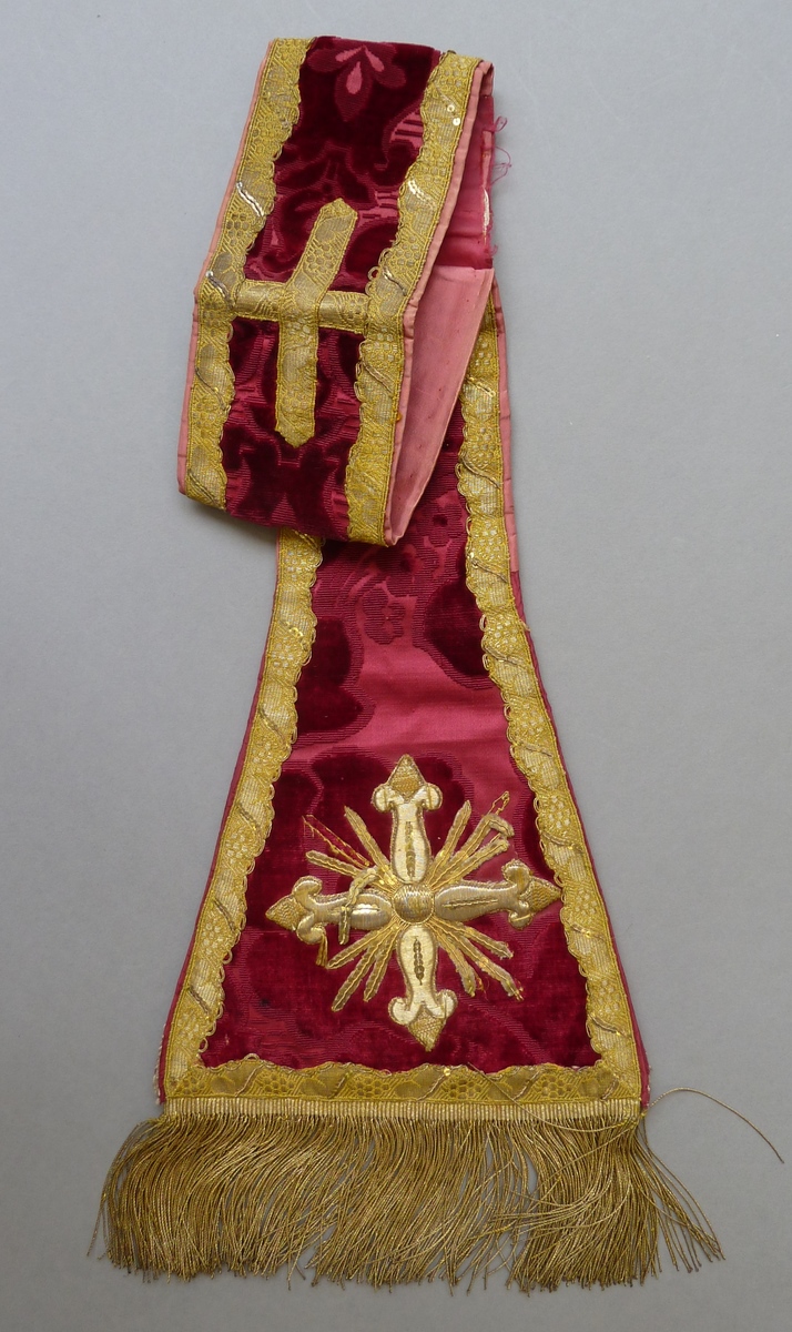 Rode manipel met ingeweven gestyleerde bladeren en bloemen en kruis van gehoogd gouddraad