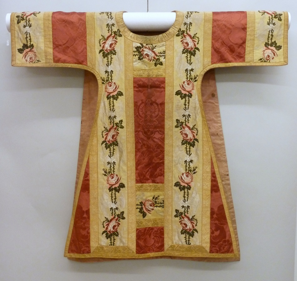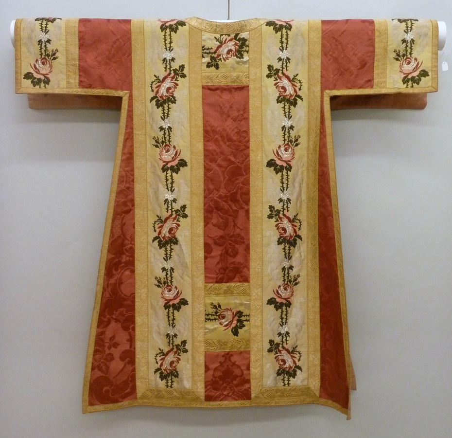 Rode dalmatiek met ingeweven granaatappelmotief en goudkleurige kolommen van zijde-zilverbrokaat