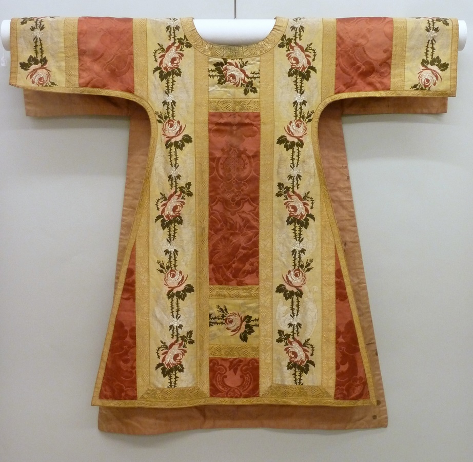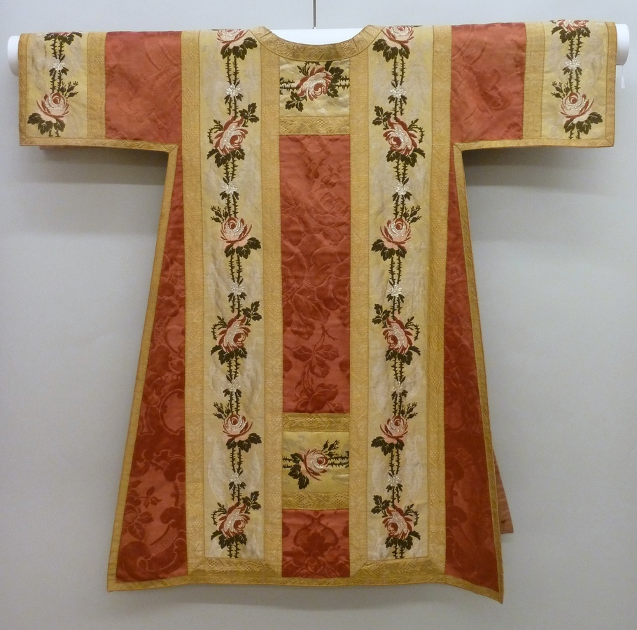 Rode dalmatiek met ingeweven granaatappelmotief en goudkleurige kolommen van zijde-zilverbrokaat