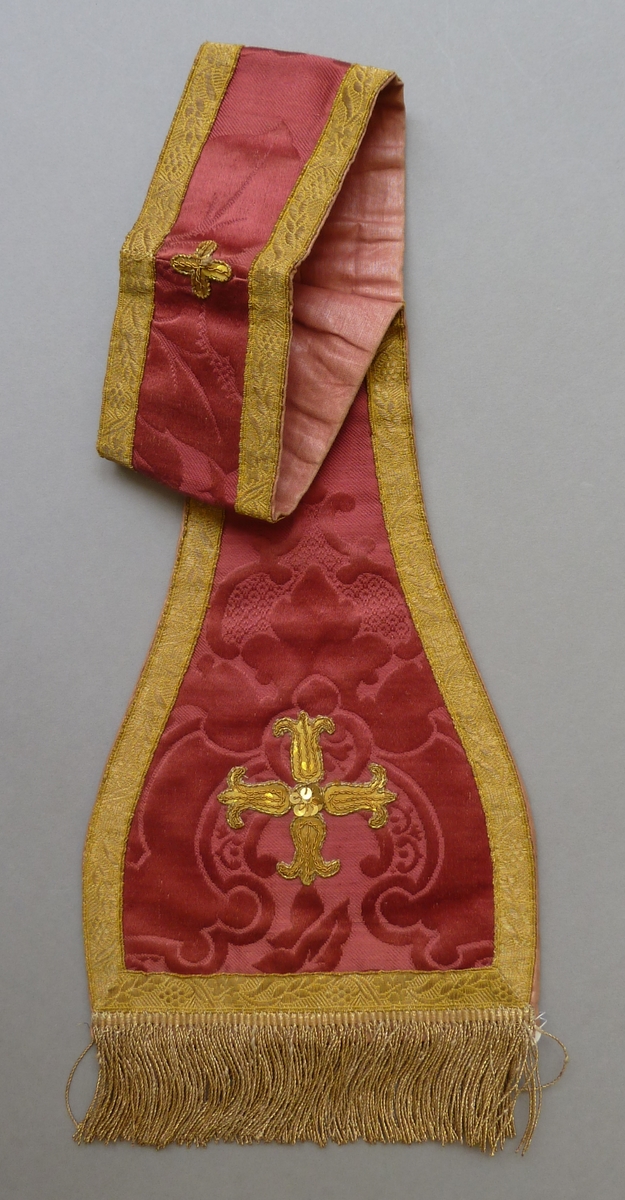 Rode manipel met ingeweven granaatappelmotief en kruis van goudkleurige pailletten, met goudfranje