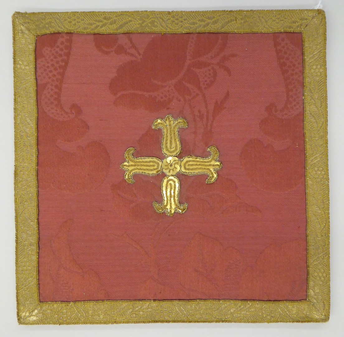 Rode beurs met ingeweven granaatappelmotief en kruis van goudkleurige pailletten