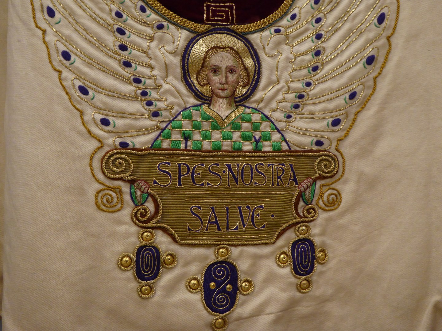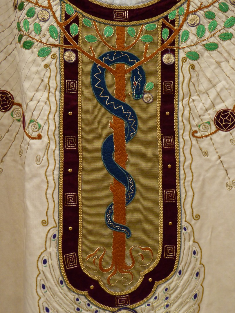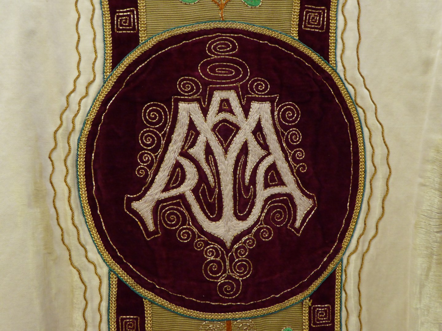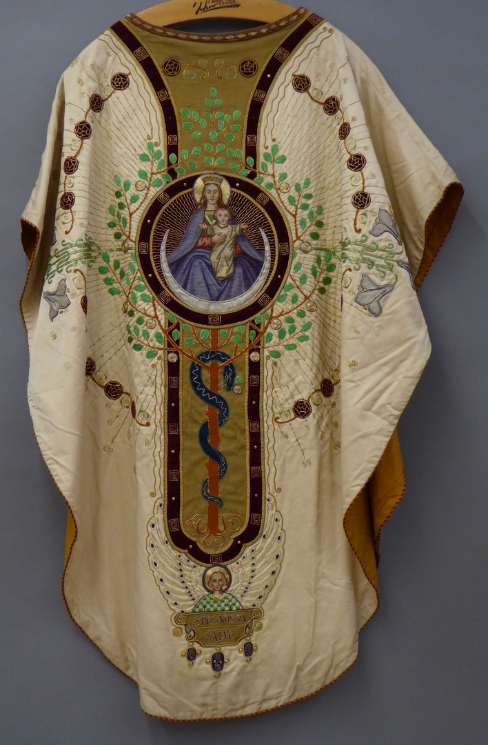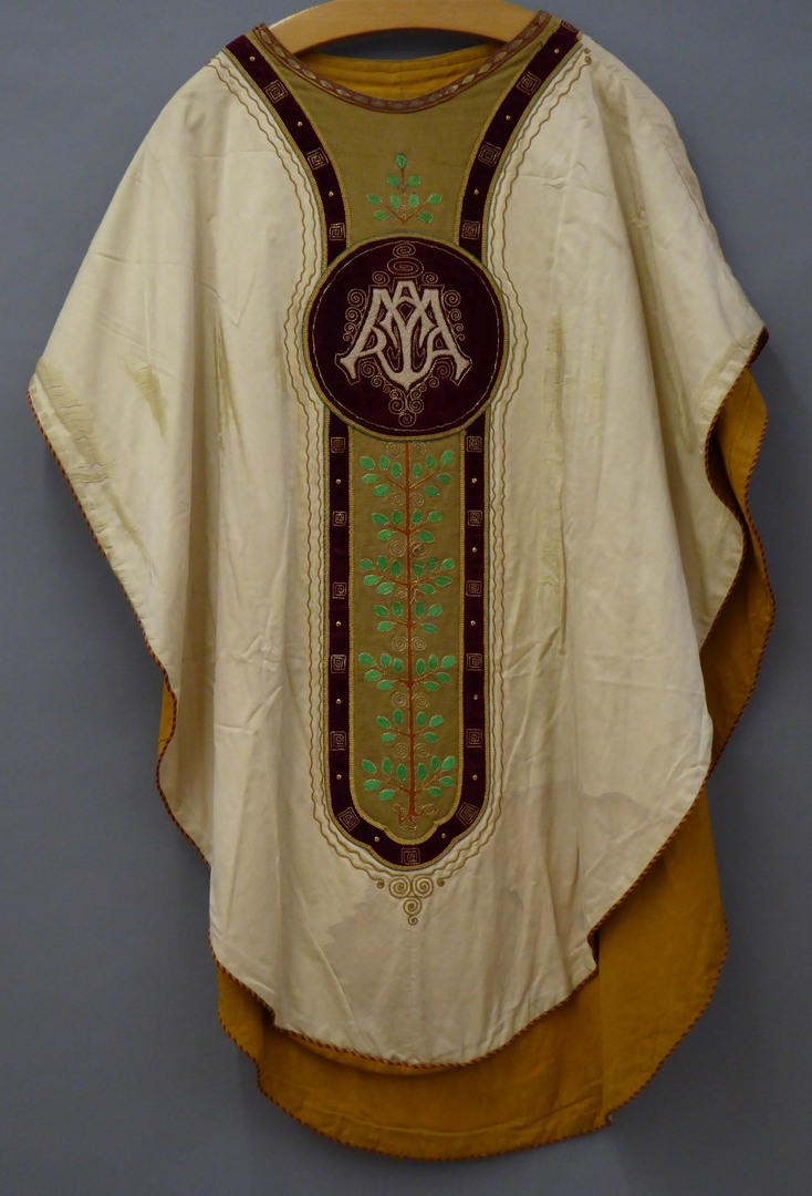 Wit kazuifel met beige kolom en kruis, levensboom en Maria op de maansikkel