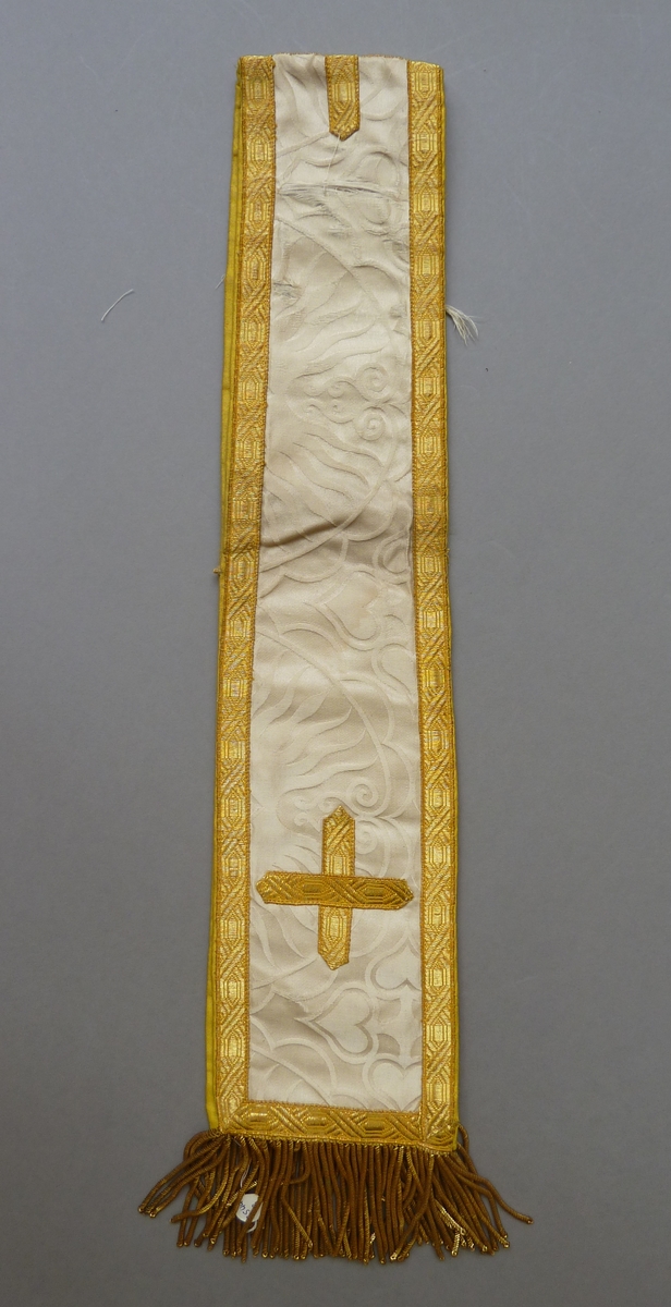 Witte manipel met ingeweven kruisjes omgeven door vlammen, franjes van goudkoord
