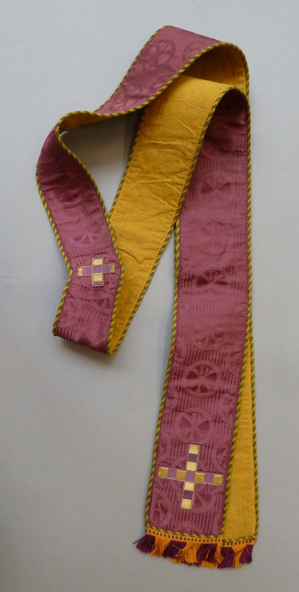 Lila stola met ingeweven cirkels waarin PX, afgezet met paarsgele franje